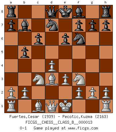 Last move : 0-1 2007 February 25 17:50:58 [Event "FICGS__CHESS__CLASS_B__000013"] [Site "FICGS"] [Date "2007.01.13"] [Round "1"] [White "Fuertes,Cesar"] [Black "Pecotic,Kuzma"] [Result "0-1"] [WhiteElo "1939"] [BlackElo "2163"] 1.d4 Nf6 2.c4 e6 3.Nf3 d5 4.Nc3 c6 5.e3 Nbd7 6.Bd3 dxc4 7.Bxc4 b5 8.Bd3 Bb7 0-1 This chess game has been lost on time (started : 2007.01.13 9:33:15) Queen's pawn game Player Black won this chess game. Follow this game move after move (download)It is the aim of the modern school, not to treat every position according to one general law, but according to the principle inherent in the position. (Richard Reti) Ich rechne überhaupt nicht voraus. Ich gewinne auch so. (Robert James Fischer) El Ajedrez es un terrible juego. Si no controlas el centro, tu oponente tiene una posición mas holgada. Si tienes control del centro, ¡entonces realmente tu tienes algo de que preocuparte!. (Siegbert Tarrasch) L'ordinateur a tué l'originalité. Il n'y a plus guère d'aventures sur l'échiquier. (Jacob Murray) Thus, what is of supreme importance in war is to attack the enemy's strategy. (Sun Tzu)