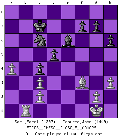 Last move : 1-0 2007 January 24 0:7:16 [Event "FICGS__CHESS__CLASS_E__000029"] [Site "FICGS"] [Date "2007.01.13"] [Round "1"] [White "Sert,Ferdi"] [Black "Caburro,John"] [Result "1-0"] [WhiteElo "1397"] [BlackElo "1449"] 1.e4 e5 2.Nc3 Nf6 3.f4 d5 4.fxe5 Nxe4 5.Nf3 Nxc3 6.dxc3 Bg4 7.Bd3 Bc5 8.a4 a5 9.Qe2 O-O 10.Be3 Bxe3 11.Qxe3 Nc6 12.O-O Qe7 13.Rae1 Rae8 14.Ng5 h6 15.Nh7 Qxe5 16.Qxe5 Rxe5 17.Nxf8 Rxe1 18.Rxe1 Kxf8 19.h3 Be6 20.Bb5 Ne7 21.b4 c6 22.Bd3 Ke8 23.bxa5 Kd7 24.a6 bxa6 25.Bxa6 Kc7 26.Bd3 c5 27.Rb1 c4 28.Be2 Nc6 29.Bf3 1-0 Vienna gambit Kingside Castling by player Black (move 9) Kingside Castling by player White (move 12) Player White won this chess game. Follow this game move after move (download)Fischer is the strongest player in the world. In fact, the strongest player who ever lived. (Larry Evans) Gegen einen Schachcomputer zu verlieren ist wie Löcher in den Strümpfen zuhaben. Es ist nicht peinlich, solange man der einzige ist der es weiß. (Anonymous) La pasion por jugar al Ajedrez es una de las mas inexplicables en el mundo. (H.G. Wells) Je fais ceci parce que dans cinquante coups j'obtiendrai cela; je m'appelle Mikhail Moisevitch Botvinnik. (Botvinnik) In fact if nothing is done against this teddy bear, hereby I announce that I would quit chess, rapid chess, blitz chess, postal chess, email chess, server chess and correspondence chess I will then switch to a table game where teddy bears aren't going to be seen for a while, like Poker, or Roulette, all 18+ games. (Elmer Valderrama)
