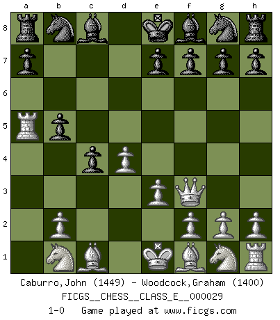 Last move : 1-0 2007 January 19 19:57:53 [Event "FICGS__CHESS__CLASS_E__000029"] [Site "FICGS"] [Date "2007.01.13"] [Round "1"] [White "Caburro,John"] [Black "Woodcock,Graham"] [Result "1-0"] [WhiteElo "1449"] [BlackElo "1400"] 1.d4 d5 2.c4 dxc4 3.e3 b5 4.a4 c6 5.axb5 cxb5 6.Qf3 Qa5+ 7.Rxa5 1-0 Queen's gambit accepted Player White won this chess game. Follow this game move after move (download)Place the contents of the Chess box in a hat, shake them up vigorously, pour them on the board from a height of two feet, and you get the style of Steinitz. (H. E. Bird) Das typische an einem Großmeister ist, daß er eine gewonnene Position schnell und schmerzlos gewinnt. (Irving Chernev) Yo nunca en mi vida he jugado la Defensa Francesa, que viene siendo la más aburrida de todas las Aperturas. (Wilhelm Steinitz) Les échecs, c'est l'imagination. (David Bronstein) To err is human, to shift the blame on someone else is tactical. (Mladen Jankovic)