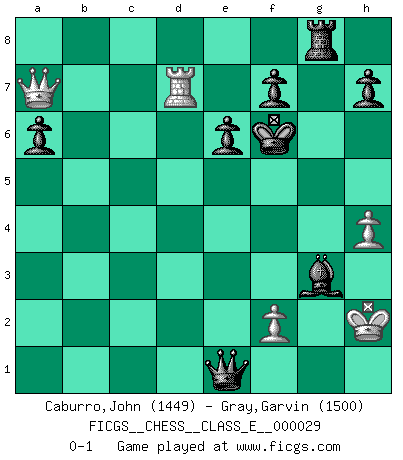 Last move : 0-1 2007 January 30 10:50:38 [Event "FICGS__CHESS__CLASS_E__000029"] [Site "FICGS"] [Date "2007.01.13"] [Round "1"] [White "Caburro,John"] [Black "Gray,Garvin"] [Result "0-1"] [WhiteElo "1449"] [BlackElo "1500"] 1.d4 Nf6 2.e4 Nxe4 3.Bd3 Nf6 4.Nf3 e6 5.h4 c5 6.c3 Nc6 7.Qe2 cxd4 8.cxd4 Qb6 9.Be3 Nb4 10.Nc3 Nxd3+ 11.Qxd3 Qxb2 12.Rb1 Qa3 13.O-O b6 14.Rb3 Ba6 15.Nb5 Bxb5 16.Qxb5 Qxa2 17.Ne5 Rc8 18.Bg5 Rc7 19.Bxf6 gxf6 20.Rc3 a6 21.Qxb6 Rxc3 22.Qb8+ Ke7 23.Qb4+ Kd8 24.Qxc3 fxe5 25.dxe5 Rg8 26.Rd1 Qa4 27.Rd4 Qb5 28.Qf3 Qxe5 29.Qa8+ Ke7 30.Qa7 Kf6 31.Rxd7 Qe1+ 32.Kh2 Bd6+ 33.g3 Bxg3+ 0-1 Queen's pawn game Kingside Castling by player White (move 13) Player Black won this chess game. Follow this game move after move (download)First-class players lose to second-class players because second-class players sometimes play a first-class game. (Siegbert Tarrasch) Schach ist ein schwarz-weisser Dschungel. (Garry Kasparov) El Ajedrez es sobre todo, ¡una pelea!. (Emanuel Lasker) Je ne suis pas le dernier à jouer lâchement des coups douteux pendant le zeïtnot de l'adversaire pour l'achever: en effet les coups qui font le plus peur sont ceux que l'on ne comprend pas. Je me fais souvent peur quand je joue. (Un professeur anonyme) Shallow men believe in luck. Strong men belive in cause and effect. (Ralph Waldo Emerson)