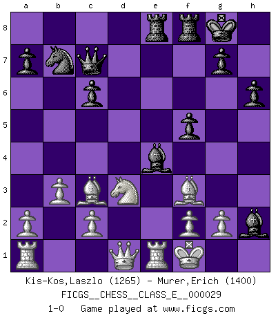 Last move : 1-0 2007 May 8 8:9:38 [Event "FICGS__CHESS__CLASS_E__000029"] [Site "FICGS"] [Date "2007.01.13"] [Round "1"] [White "Kis-Kos,Laszlo"] [Black "Murer,Erich"] [Result "1-0"] [WhiteElo "1265"] [BlackElo "1400"] 1.e4 e5 2.Nf3 Nc6 3.Bc4 Nf6 4.Ng5 d5 5.exd5 Na5 6.Bb5+ c6 7.dxc6 bxc6 8.Be2 h6 9.Nf3 e4 10.Ne5 Bd6 11.d4 exd3 12.Nxd3 Qc7 13.b3 O-O 14.Bb2 Ne4 15.Nd2 Bf5 16.Nxe4 Bxe4 17.O-O Bxh2+ 18.Kh1 Bd6 19.Bf3 Rae8 20.Re1 f5 21.Bc3 Nb7 22.Kg1 Bh2+ 23.Kf1 1-0 Two knights defense Kingside Castling by player Black (move 13) Kingside Castling by player White (move 17) Player White won this chess game. Follow this game move after move (download)Fischer Chess play was always razor-sharp, rational and brilliant. One of the best ever. (Dave Regis) Wie gewinnt Tal? Er entwickelt alle seine Figuren in die Brettmitte und opfert sie dann irgendwo. (Robert James Fischer) La táctica fluye a partir de una posición superior. (Bobby Fischer) J'apprécie les joueurs d'est-indienne, c'est grâce à eux que je nourris ma famille depuis tant d'années. (Petrosian) We need strong personalities and only one world champion to attract sponsors. (Anatoly Karpov)