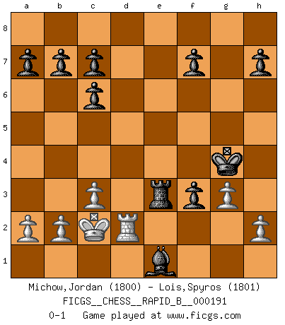Last move : 0-1 2012 January 28 15:47:37 [Event "FICGS__CHESS__RAPID_B__000191"] [Site "FICGS"] [Date "2012.01.02"] [Round "1"] [White "Michow,Jordan"] [Black "Lois,Spyros"] [Result "0-1"] [WhiteElo "1800"] [BlackElo "1801"] 1.e4 e5 2.Nf3 Nc6 3.d4 exd4 4.Nxd4 Bc5 5.Nxc6 dxc6 6.Qxd8+ Kxd8 7.Bc4 Nf6 8.Bg5 Re8 9.Bxf6+ gxf6 10.Nc3 Ke7 11.O-O-O Rg8 12.e5 fxe5 13.Rhe1 Be6 14.Bxe6 Kxe6 15.Ne4 Bb6 16.f4 exf4 17.Ng3 Be3+ 18.Kb1 Rad8 19.Rxd8 Rxd8 20.Nf1 Kf5 21.g3 Bf2 22.Rc1 f3 23.c3 Re8 24.Rd1 Kg4 25.Kc2 Re2+ 26.Rd2 Be1 27.Ne3+ Rxe3 0-1 Scotch game Queenside Castling by player White (move 11) Player Black won this chess game. Follow this game move after move (download)When you play Bobby, it is not a question if you win or lose. It is a question if you survive. (Boris Spassky) Der Vorposten provoziert a) eine Basis für neue Angriffe und b) eine Schwächung der gegnerischen Widerstandskraft in der fraglichen Linie. (Aaron Nimzowitsch) Es el objetivo de la escuela moderna no tratar cada posición de acuerdo a una regla general, sino de acuerdo al principio inherente en la posición. (Richard Reti) Il (Jacob Murray) ne joue pas pour le bon coup, mais pour le meilleur. (Eloi Relange) If you don't practice you don't deserve to win. (Andre Agassi)