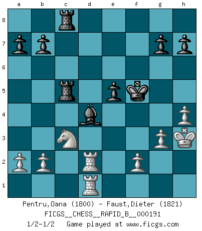 Last move : 1/2-1/2 2012 January 31 10:14:39 [Event "FICGS__CHESS__RAPID_B__000191"] [Site "FICGS"] [Date "2012.01.02"] [Round "1"] [White "Pentru,Oana"] [Black "Faust,Dieter"] [Result "1/2-1/2"] [WhiteElo "1800"] [BlackElo "1821"] 1.e4 c5 2.Nf3 d6 3.Bb5+ Bd7 4.Bxd7+ Qxd7 5.O-O Nc6 6.c3 Nf6 7.Qe2 e6 8.d4 cxd4 9.cxd4 d5 10.e5 Ne4 11.Be3 Be7 12.Nbd2 O-O 13.Rac1 f6 14.exf6 Bxf6 15.Nxe4 dxe4 16.Nd2 Nxd4 17.Bxd4 Bxd4 18.Nxe4 Rf5 19.h3 Qd5 20.Nc3 Qe5 21.Qxe5 Rxe5 22.Rfd1 Rd8 23.g3 Kf7 24.Kg2 Rc5 25.h4 Kg6 26.Rc2 e5 27.Rcd2 Kf5 28.Kh3 Rdc8 1/2-1/2 Sicilian : Canal-Sokolsky attack, 3...Bd7 Kingside Castling by player White (move 5) Kingside Castling by player Black (move 12) This chess game ended in a draw. Follow this game move after move (download)In complicated positions, Bobby Fischer hardly had to be afraid of anybody. (Paul Keres) Ich tröste mich mit dem Vergnügen, daß Schachfans, Zuschauer und Leser glücklich sind, wenn ein Großmeister etwas riskiert, statt nur Klötzchen zu schieben. (Mikhail Nekhemyevich Tal) El Ajedrez es un juego de pelea el cual es puramente intelectual e incluye la suerte. (Richard Reti) Le plus grand jeu de l'esprit jamais inventé, plus vous l'apprenez, plus vous y prenez du plaisir. (Garry Kasparov) If you ain't just a little scared when you enter a casino, you are either very rich or you haven't studied the games enough. (Pappy)