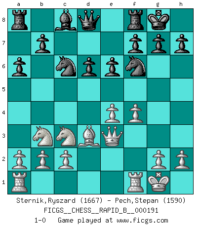 Last move : 1-0 2012 March 11 20:31:10 [Event "FICGS__CHESS__RAPID_B__000191"] [Site "FICGS"] [Date "2012.01.02"] [Round "1"] [White "Sternik,Ryszard"] [Black "Pech,Stepan"] [Result "1-0"] [WhiteElo "1667"] [BlackElo "1590"] 1.e4 c5 2.Nf3 e6 3.d4 cxd4 4.Nxd4 a6 5.Bd3 Bc5 6.Nb3 Ba7 7.Qe2 Nc6 8.Be3 Bxe3 9.Qxe3 Nf6 10.Nc3 d6 11.O-O O-O 12.f4 1-0 This chess game has been lost on time (started : 2012.01.02 14:2:27) Sicilian : Kan, Polugaievsky variation Kingside Castling by player White (move 11) Kingside Castling by player Black (move 11) Player White won this chess game. Follow this game move after move (download)My God, Bobby Fischer plays so simply. (Alexei Suetin) Um dein Spiel zu verbessern musst du zuallererst das Endspiel studieren, denn diese kann unabhängig studiert werden. Die Eröffnung und das Mittelspiel müssen immer in Bezug gesetzt werden zum Endspiel. (José Raúl Capablanca) Fischer es una tragedia del Ajedrez Americano a la par con Morphy y Pillsbury. (Mig Greengard) La tactique est l'élément le plus important du milieu de jeu. (Siegbert Tarrasch) The intuitive mind is a sacred gift; the rational mind is a faithful servant. We have created a society that honors the servant but has forgotten the gift. (Albert Einstein)
