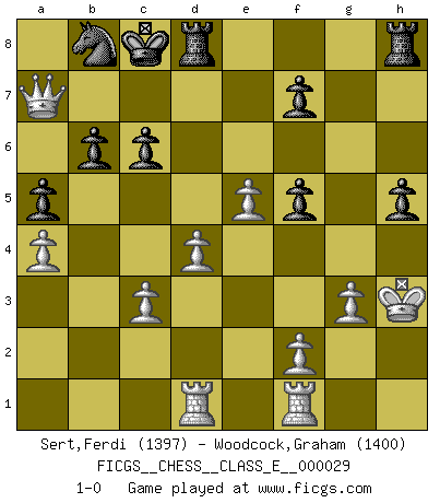 Last move : 1-0 2007 March 28 20:24:54 [Event "FICGS__CHESS__CLASS_E__000029"] [Site "FICGS"] [Date "2007.01.13"] [Round "1"] [White "Sert,Ferdi"] [Black "Woodcock,Graham"] [Result "1-0"] [WhiteElo "1397"] [BlackElo "1400"] 1.d4 e6 2.c4 d5 3.Nf3 dxc4 4.Nc3 Bb4 5.e4 Nf6 6.Bg5 h6 7.Bxf6 Bxc3+ 8.bxc3 Qxf6 9.Bxc4 b6 10.O-O Bb7 11.Qa4+ Nd7 12.Ne5 O-O-O 13.Nc6 Bxc6 14.Qxc6 Nb8 15.Qa8 a5 16.e5 Qf4 17.Rad1 g5 18.g3 Qg4 19.Kg2 h5 20.h3 Qf5 21.Bd3 g4 22.Bxf5 exf5 23.a4 c6 24.Qa7 gxh3+ 25.Kxh3 1-0 Queen's pawn Kingside Castling by player White (move 10) Queenside Castling by player Black (move 12) Player White won this chess game. Follow this game move after move (download)After a bad opening, there is hope for the middle game. After a bad middle game, there is hope for the endgame. But once you are in the endgame, the moment of truth has arrived. (Edmar Mednis) Bogoljubow: Matt in vier Zügen! Tartakower: Ich verbitte mir jede Belästigung! (Savielly Grigorievitsch Tartakower) Muchos se han convertido en Maestros de Ajedrez, nadie se ha convertido en el Maestro del Ajedrez. (Siegbert Tarrasch) On peut tirer plus d'utilité d'une partie perdue que de 100 parties gagnées. (Capablanca) Establishing goals is all right if you don't let them deprive you of interesting detours. (Doug Larson)