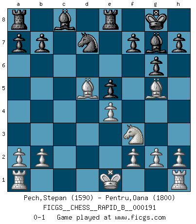 Last move : 0-1 2012 March 18 9:20:19 [Event "FICGS__CHESS__RAPID_B__000191"] [Site "FICGS"] [Date "2012.01.02"] [Round "1"] [White "Pech,Stepan"] [Black "Pentru,Oana"] [Result "0-1"] [WhiteElo "1590"] [BlackElo "1800"] 1.c4 Nf6 2.Nc3 g6 3.Nf3 Bg7 4.d4 O-O 5.e4 d6 6.Be2 e5 7.dxe5 dxe5 8.Qxd8 Rxd8 9.Bg5 Re8 10.Nd5 Nxd5 11.cxd5 c6 12.Bc4 cxd5 13.Bxd5 Nd7 0-1 This chess game has been lost on time (started : 2012.01.02 14:2:27) English Opening Kingside Castling by player Black (move 4) Player Black won this chess game. Follow this game move after move (download)I like to say that Bobby Fischer was the greatest player ever. But what made Fischer a genius was his ability to blend an American freshness and pragmatism with Russian ideas about strategy. (Bruce Pandolfini) Vom Schach wurde gesagt das Leben sei dafür nicht lange genug. Aber das ist der Fehler des Lebens, nicht des Schach'. (Irving Chernev) Durante una competencia de Ajedrez, un Maestro de Ajedrez deberá ser una combinación de presa de caza y un Monge. (Alexander Alekhine) Des idées, des idées, j'en ai cent, j'en ai mille. Des bonnes, des mauvaises, applicables, irréalisables... Il suffit de faire le tri ! (Roos) Wawaweewa ! (Borat: Cultural learnings of America for make benefit glorious nation of Kazakhstan)