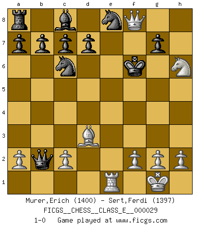 Last move : 1-0 2007 January 27 11:36:17 [Event "FICGS__CHESS__CLASS_E__000029"] [Site "FICGS"] [Date "2007.01.13"] [Round "1"] [White "Murer,Erich"] [Black "Sert,Ferdi"] [Result "1-0"] [WhiteElo "1400"] [BlackElo "1397"] 1.e4 e5 2.Nf3 f5 3.Nxe5 Qf6 4.Nc4 fxe4 5.Nc3 Qg6 6.d3 Bb4 7.dxe4 Qxe4+ 8.Ne3 Bxc3+ 9.bxc3 Nf6 10.Bd3 Qc6 11.O-O O-O 12.Nf5 Re8 13.Re1 Kf7 14.Rxe8 Nxe8 15.Qh5+ Kf8 16.Qxh7 Qxc3 17.Bb2 Qxb2 18.Qh8+ Kf7 19.Re1 Nc6 20.Nh6+ Kf6 21.Qf8+ 1-0 Latvian counter-gambit Kingside Castling by player White (move 11) Kingside Castling by player Black (move 11) Player White won this chess game. Follow this game move after move (download)You know, comrade Pachman, I don't enjoy being a Minister, I would rather play Chess like you. (Che Guevara) Ja, ich habe einmal eine Blitzpartie gespielt, es war in einem Zug, 1929. --im Interview 1989 (Mikhail Moiseyevich Botvinik) Si el Ajedrez es una ciencia, es la mas inexacta. Si el Ajedrez es un arte, es demasiado inexacto para ser visto como tal. Si el Ajedrez es un deporte, es demasiado esotérico. Si el Ajedrez es un juego, es demasiado exigente para ser solo un juego. Si el Ajedrez es una aventura, es una muy demandante. Si el Ajedrez es una pasión, es una muy gratificante. Si el Ajedrez es la vida, es una muy triste. (Anónimo) Il s'avisa de me proposer d'apprendre les échecs qu'il jouait un peu... me voilà forcené des échecs. J'achète un échiquier, je m'enferme dans ma chambre, j'y passe des jours et des nuits à vouloir apprendre par cur toutes les parties. (Jean-Jacques Rousseau, Confessions) May I never be complete. May I never be content. May I never be perfect. Deliver me, Tyler, from being perfect and complete. (Chuck Palahniuk, Fight Club)