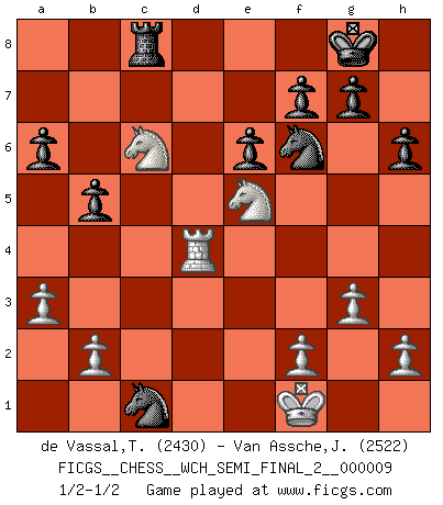 Last move : 1/2-1/2 2012 March 11 15:57:50 [Event "FICGS__CHESS__WCH_SEMI_FINAL_2__000009"] [Site "FICGS"] [Date "2012.01.02"] [Round "4"] [White "de Vassal,Thibault"] [Black "Van Assche,Jeroen"] [Result "1/2-1/2"] [WhiteElo "2430"] [BlackElo "2522"] 1.d4 Nf6 2.c4 e6 3.g3 d5 4.Bg2 Be7 5.Nf3 O-O 6.O-O dxc4 7.Qc2 a6 8.Qxc4 b5 9.Qc2 Bb7 10.Bd2 Ra7 11.Rd1 Nbd7 12.Ba5 Qa8 13.Nbd2 c5 14.dxc5 Bxc5 15.Rac1 h6 16.Nb3 Bb6 17.Bxb6 Nxb6 18.Na5 Be4 19.Qc3 Nbd5 20.Qd4 Rd7 21.Ne5 Nf4 22.Bxe4 Nxe2+ 23.Kf1 Rxd4 24.Bxa8 Nxc1 25.Rxd4 Rxa8 26.a3 Rc8 27.Nac6 1/2-1/2 Catalan : Closed, 5.Nf3 Kingside Castling by player Black (move 5) Kingside Castling by player White (move 6) This chess game ended in a draw. Follow this game move after move (download)The stomach is an essential part of the Chess master. (Bent Larsen) Ein Schachgenie ist jemand der verdammt gut Schach spielt. (Jonathan Levitt) En un gambito tu regalas un Peón por el bién de tomar un juego perdido. (Samuel Standige Boden) Il n'y a pas eu de défaite parce que je ne crois pas que cet ordinateur ait jamais existé. IBM a triché en refusant d'imprimer les modes de recherche de la machine. C'est évident, pendant le match, des coups décisifs ont été joués par des êtres humains. Aujourd'hui, les meilleurs spécialistes en informatique ne peuvent toujours pas expliquer comment Deep-Blue a pu jouer contre la logique des ordinateurs. IBM a gagné une guerre de communication, mais ils sont incapables de prouver que l'ordinateur a gagné tout seul. (Garry Kasparov) Thibault, I ask for draw. Game 13876. - Sorry Ilmars, you won. (FICGS chat)