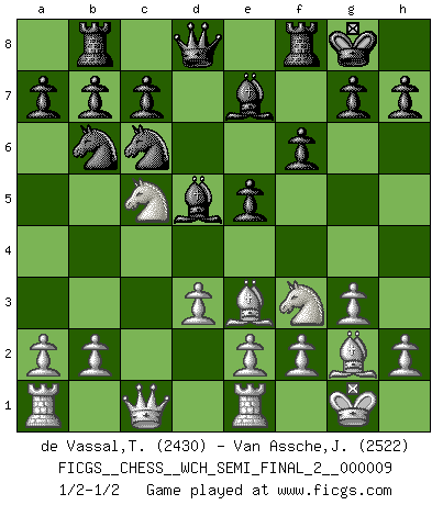 Last move : 1/2-1/2 2012 February 24 10:5:51 [Event "FICGS__CHESS__WCH_SEMI_FINAL_2__000009"] [Site "FICGS"] [Date "2012.01.02"] [Round "6"] [White "de Vassal,Thibault"] [Black "Van Assche,Jeroen"] [Result "1/2-1/2"] [WhiteElo "2430"] [BlackElo "2522"] 1.c4 e5 2.Nc3 Nf6 3.g3 d5 4.cxd5 Nxd5 5.Bg2 Nb6 6.Nf3 Nc6 7.O-O Be7 8.d3 O-O 9.Be3 Be6 10.Qc1 f6 11.Ne4 Rb8 12.Nc5 Bd5 13.Re1 Nd7 14.Ne4 Nb6 15.Nc5 1/2-1/2 English : Bremen, reverse Dragon Kingside Castling by player White (move 7) Kingside Castling by player Black (move 8) This chess game ended in a draw. Follow this game move after move (download)Excellence at Chess is one mark of a scheming mind. (Sir Arthur Conan Doyle) Jeder Fehler erscheint unglaublich dumm, wenn andre ihn begehen. (Georg Christoph Lichtenberg) El Ajedrez es tan inspirador que yo no creo que un buen jugador sea capaz de tener un pensamiento malo durante una partida. (Wilhelm Steinitz) L'attaque fait le spectacle, la défense gagne les matchs. (Dicton footballistique) Lottery : A tax on people who are bad at math. (Author unknown)