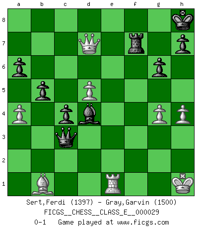 Last move : 0-1 2007 January 19 16:13:42 [Event "FICGS__CHESS__CLASS_E__000029"] [Site "FICGS"] [Date "2007.01.13"] [Round "1"] [White "Sert,Ferdi"] [Black "Gray,Garvin"] [Result "0-1"] [WhiteElo "1397"] [BlackElo "1500"] 1.d4 Nf6 2.c4 e6 3.Nc3 c5 4.d5 exd5 5.cxd5 d6 6.e4 g6 7.Nf3 Bg7 8.Bd3 O-O 9.O-O Bg4 10.h3 Bxf3 11.Qxf3 a6 12.a4 Nbd7 13.Bf4 Qc7 14.g4 Rfe8 15.Rae1 Ne5 16.Bxe5 Rxe5 17.Qg3 c4 18.Bb1 Nd7 19.f4 R5e8 20.h4 Qb6+ 21.Kh1 Qxb2 22.e5 b5 23.Ne4 dxe5 24.Nd6 exf4 25.Qxf4 Rxe1 26.Qxf7+ Kh8 27.Rxe1 Be5 28.Kg1 Bd4+ 29.Kh1 Rf8 30.Qxd7 Qc3 31.Nf7+ Rxf7 0-1 Queen's pawn game Kingside Castling by player Black (move 8) Kingside Castling by player White (move 9) Player Black won this chess game. Follow this game move after move (download)Chess is mental torture. (Garry Kasparov) Wer mein Gambit spielt, muß bereit sein, alle Brücken hinter sich abzubrechen. Es verändert den ganzen Menschen. Es wirkt wie ein Zauberstab und fördert verkümmerte, gute Charakter- eigenschaften wieder zu Tage. (Emil Joseph Diemer) La batalla por la última verdad nunca sera ganada. Y es por eso que el Ajedrez es tan fascinante. (Hans Kmoch) Aux échecs, les retours au sommet sont rares : les dommages psychologiques consécutifs à une défaite sont trop sévères. (Daily Telegraph) Memory is a way of holding onto the things you love, the things you are, the things you never want to lose. (from the television show: The Wonder Years)