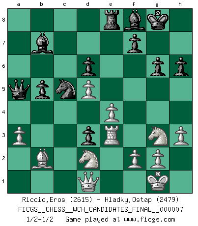 Last move : 1/2-1/2 2012 May 29 4:27:16 [Event "FICGS__CHESS__WCH_CANDIDATES_FINAL__000007"] [Site "FICGS"] [Date "2012.01.02"] [Round "1"] [White "Riccio,Eros"] [Black "Hladky,Ostap"] [Result "1/2-1/2"] [WhiteElo "2615"] [BlackElo "2479"] 1.e4 e5 2.Nf3 Nc6 3.Bb5 a6 4.Ba4 Nf6 5.O-O Be7 6.Re1 b5 7.Bb3 d6 8.c3 O-O 9.h3 Bb7 10.d4 Re8 11.Nbd2 Bf8 12.a4 h6 13.Bc2 exd4 14.cxd4 Nb4 15.Bb1 c5 16.d5 Nd7 17.Ra3 c4 18.axb5 axb5 19.Nd4 Rxa3 20.bxa3 Nd3 21.Bxd3 cxd3 22.Re3 Nc5 23.Bb2 Qa5 24.Nf5 g6 25.Ng3 Be7 26.Nf5 Bf8 27.Ng3 1/2-1/2 Ruy Lopez : Closed Kingside Castling by player White (move 5) Kingside Castling by player Black (move 8) This chess game ended in a draw. Follow this game move after move (download)Chess opens and enriches your mind. (Saudin Robovic) Fischer: 'Remis!?' Uhlmann: 'Aber es muss doch dreimal Zugwiederholung sein!' Fischer: 'Sie nehmen das Remis an, wie ich es sage, sonst spiele ich weiter und werde Sie dann schlagen!' (Robert James Fischer) Jugadores de primera clase pierden en contra de jugadores de segunda clase porque los jugadores de segunda clase a veces juegan una partida de primer clase. (Siegbert Tarrasch) Mais l'homme est une créature légère et illogique : semblable au joueur d'échecs, il n'aime que le processus du but à atteindre, non le but lui-même. (Dostoïevsky) A generalist learns less and less about more and more until he knows nothing about everything. (Author unknown)