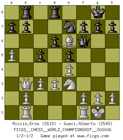 Last move : 1/2-1/2 2012 May 7 7:41:18 [Event "FICGS__CHESS__WORLD_CHAMPIONSHIP__000006"] [Site "FICGS"] [Date "2012.01.02"] [Round "1"] [White "Riccio,Eros"] [Black "Gueci,Alberto"] [Result "1/2-1/2"] [WhiteElo "2615"] [BlackElo "2545"] 1.e4 c5 2.Nc3 d6 3.Nge2 e5 4.Nd5 Ne7 5.Nec3 Nbc6 6.Bc4 Nxd5 7.Nxd5 Be6 8.O-O Be7 9.d3 O-O 10.Be3 Bg5 11.a4 Bxe3 12.Nxe3 Qg5 13.a5 Ne7 14.c3 Rab8 15.Rb1 Rfd8 16.Qb3 Qf6 17.Bxe6 1/2-1/2 Sicilian : Closed Kingside Castling by player White (move 8) Kingside Castling by player Black (move 9) This chess game ended in a draw. Follow this game move after move (download)It is peculiar but a fact nevertheless, that gamblers in chess always have enthusiastic followers. (Botvinnik) Ich bin Weltmeister und muß mit niemandem irgend etwas diskutieren. (Viswanathan Anand) No existe un remordimiento como el remordimiento del Ajedrez. (H. G. Wells) Nous vivons dans un monde échiquéen : chaque jour qui passe est un défi à relever. (Philosophe Sasha) The only thing that matters is the evidence. (Horatio Caine, C.S.I. Miami)