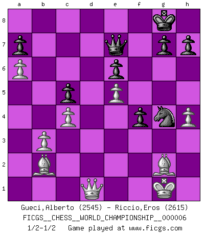 Last move : 1/2-1/2 2012 September 11 15:16:25 [Event "FICGS__CHESS__WORLD_CHAMPIONSHIP__000006"] [Site "FICGS"] [Date "2012.01.02"] [Round "10"] [White "Gueci,Alberto"] [Black "Riccio,Eros"] [Result "1/2-1/2"] [WhiteElo "2545"] [BlackElo "2615"] 1.d4 Nf6 2.c4 e6 3.Nf3 b6 4.g3 Ba6 5.b3 Bb4+ 6.Bd2 Be7 7.Bg2 c6 8.Bc3 d5 9.Ne5 Nfd7 10.Nxd7 Nxd7 11.Nd2 O-O 12.O-O f5 13.Bb2 Bd6 14.a4 Qe7 15.Qc2 Bb7 16.a5 Rad8 17.e3 Nf6 18.Rfc1 Ne4 19.a6 Bc8 20.Nf3 Bd7 21.Rd1 Be8 22.Ne5 Bxe5 23.dxe5 Bh5 24.f3 Ng5 25.Rf1 c5 26.h4 Nf7 27.Rad1 Nh6 28.Rfe1 d4 29.exd4 f4 30.g4 Bxg4 31.dxc5 bxc5 32.Rxd8 Rxd8 33.fxg4 Nxg4 34.Rd1 Rxd1+ 35.Qxd1 1/2-1/2 Queen's Indian : Nimzovich variation (exaggerated Fianchetto) Kingside Castling by player Black (move 11) Kingside Castling by player White (move 12) This chess game ended in a draw. Follow this game move after move (download)Chess is as much a mystery as women. (Purdy) Der 70jährige Viktor Kortschnoi: Die Rentenanstalt wollte mich zwingen in Rente zu gehen. Meine Frau erhält jetzt eine Pension- und ich zahle weiter in die Rentenkasse ein! (Viktor Kortschnoi) Tu sabes que vas a perder. Aún cuando tenía la ventaja, yo sabía que iba a perder. - al estar jugando con Fischer (Andrew Soltis) Toute estimation doit être constamment réévaluée. (Jacob Estrin) Animated gif is worth one mega-word. (Unknown)