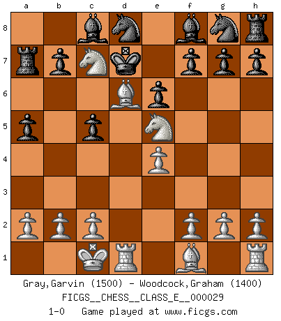 Last move : 1-0 2007 January 16 19:39:11 [Event "FICGS__CHESS__CLASS_E__000029"] [Site "FICGS"] [Date "2007.01.13"] [Round "1"] [White "Gray,Garvin"] [Black "Woodcock,Graham"] [Result "1-0"] [WhiteElo "1500"] [BlackElo "1400"] 1.e4 c5 2.Nf3 Nc6 3.d4 d6 4.dxc5 dxc5 5.Qxd8+ Nxd8 6.Nc3 e6 7.Nb5 Kd7 8.Bf4 a5 9.O-O-O Ke7 10.Nc7 Ra7 11.Bd6+ Kd7 12.Ne5+ 1-0 Sicilian defense Queenside Castling by player White (move 9) Player White won this chess game. Follow this game move after move (download)Chess is a forcing house where the fruits of character can ripen more fully than in life. (Edward Morgan Foster) Über Kasparov: Es ist offensichtlich, daß er in einem totalitären Staat aufwuchs und deshalb zu diktatorischen Zügen neigt. (Viktor Kortschnoi) El Ajedrez no es como la vida... ¡tiene reglas!. (Mark Pasternak) Le pion, dans sa simplicité, marche droit devant lui, mais lorsqu'il prend, il le fait obliquement? Ainsi l'homme, tant qu'il reste pauvre, marche dans la droiture et vit honnêtement, mais lorsqu'il recherche les honneurs, il flatte, se parjure et, par les voies obliques, cherche une position supérieure sur l'échiquier du monde. (Jean de Galles) Creativity is allowing yourself to make mistakes. Art is knowing which ones to keep. (Scott Adams)