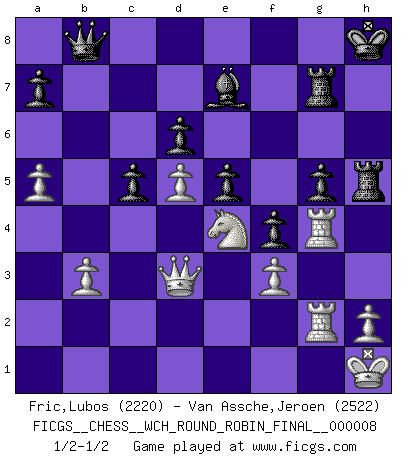 Last move : 1/2-1/2 2012 June 1 23:21:6 [Event "FICGS__CHESS__WCH_ROUND_ROBIN_FINAL__000008"] [Site "FICGS"] [Date "2012.01.02"] [Round "1"] [White "Fric,Lubos"] [Black "Van Assche,Jeroen"] [Result "1/2-1/2"] [WhiteElo "2220"] [BlackElo "2522"] 1.Nf3 Nf6 2.d4 e6 3.c4 b6 4.g3 Ba6 5.Qb3 Nc6 6.Bg2 Na5 7.Qa4 Bxc4 8.Nc3 Nd5 9.Bd2 Nxc3 10.Bxc3 Bd5 11.Bxa5 Bc6 12.Qc2 bxa5 13.O-O Be7 14.Ne5 Bxg2 15.Kxg2 O-O 16.Rac1 c6 17.Rfd1 Rb8 18.Nd3 f5 19.e3 Bd6 20.Qe2 Rb5 21.Nc5 g5 22.a4 Rb8 23.Kg1 Rf7 24.Rc3 f4 25.exf4 gxf4 26.Ne4 Bc7 27.Nc5 Rb6 28.Nd3 Rg7 29.Kh1 Qg5 30.Ne5 Rb8 31.b3 Rf8 32.Rg1 Bb6 33.Rd3 Kh8 34.g4 d6 35.Nf3 Qg6 36.R3d1 Qh6 37.Rg2 Rfg8 38.g5 Qh5 39.Re1 c5 40.Qd3 Re8 41.d5 e5 42.Nd2 Bd8 43.Reg1 Reg8 44.Nc4 Be7 45.f3 Rg6 46.Nxa5 R8g7 47.Nc4 h6 48.Nd2 hxg5 49.Rg4 Rh6 50.R1g2 Qe8 51.Ne4 Rh5 52.a5 Qb8 1/2-1/2 Reti Opening Kingside Castling by player White (move 13) Kingside Castling by player Black (move 15) This chess game ended in a draw. Follow this game move after move (download)I give 98 percent of my mental energy to Chess. Others give only 2 percent. (Bobby Fischer) Schach ist wie eine schöne Frau, zu der wir ständig zurückkehren, gleichviel, wie oft sie uns zurückweist. (Anonymous) El arma más poderosa en el Ajedrez, es tener la próxima movida. (David Bronstein) Mais n'est-ce pas déjà le limiter injurieusement que d'appeler les échecs un jeu? N'est-ce pas aussi une science, un art, ou quelque chose qui, comme le cercueil de Mahomet entre ciel et terre, est suspendu entre l'un et l'autre, et qui réunit un nombre incroyable de contraires ? (Stefan Zweig) But they are useless. They can only give you answers. (Pablo Picasso, about computers)