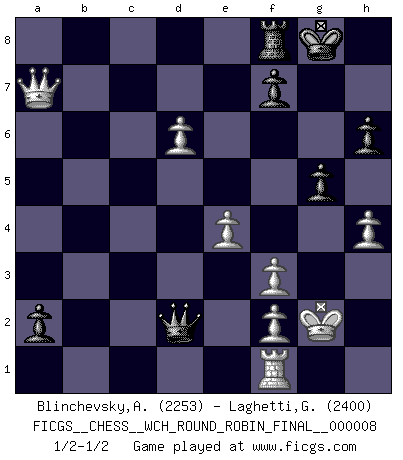 Last move : 1/2-1/2 2012 April 11 11:0:0 [Event "FICGS__CHESS__WCH_ROUND_ROBIN_FINAL__000008"] [Site "FICGS"] [Date "2012.01.02"] [Round "1"] [White "Blinchevsky,Alexander"] [Black "Laghetti,Gaetano"] [Result "1/2-1/2"] [WhiteElo "2253"] [BlackElo "2400"] 1.d4 Nf6 2.c4 g6 3.Nc3 d5 4.cxd5 Nxd5 5.e4 Nxc3 6.bxc3 Bg7 7.Nf3 c5 8.Rb1 O-O 9.Be2 cxd4 10.cxd4 Qa5+ 11.Bd2 Qxa2 12.O-O Bg4 13.Bg5 h6 14.Be3 Nc6 15.d5 Bxf3 16.Bxf3 Ne5 17.Rxb7 a5 18.Rxe7 a4 19.Bd4 Nxf3+ 20.gxf3 Bxd4 21.Qxd4 a3 22.d6 Qb2 23.Qd5 Rab8 24.Rc7 Qe2 25.Qd1 Qa6 26.Qd4 a2 27.Ra7 Qe2 28.Qd1 Qc4 29.Qc1 Qe2 30.Kg2 Ra8 31.Qa3 Rxa7 32.Qxa7 Qd2 33.h4 g5 1/2-1/2 King's Indian defense, 3.Nc3 Kingside Castling by player Black (move 8) Kingside Castling by player White (move 12) This chess game ended in a draw. Follow this game move after move (download)War is the child of passion, passion is the child of narcissism and narcissism is the child. (...) Another game ? (Thibault de Vassal) Meine Liebe ist Schach, Schach, Schach. Ich muss jeden Tag Schach spielen, deshalb fühle ich mich so stark. (Miguel Najdorf) Haz el enroque temprano y seguido. (Rob Sillars) La guerre est enfant de la passion, la passion est enfant du narcissisme et le narcissisme est l'enfant. (...) Une autre partie ? (Thibault de Vassal) The next best thing to gambling and winning is gambling and loosing. (Nick Dandalos)