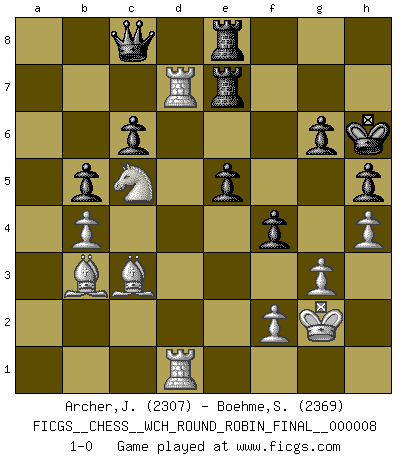 Last move : 1-0 2012 September 5 15:53:12 [Event "FICGS__CHESS__WCH_ROUND_ROBIN_FINAL__000008"] [Site "FICGS"] [Date "2012.01.02"] [Round "1"] [White "Archer,J. Robert"] [Black "Boehme,Sebastian"] [Result "1-0"] [WhiteElo "2307"] [BlackElo "2369"] 1.d4 Nf6 2.c4 g6 3.Nc3 d5 4.Nf3 Bg7 5.Qb3 dxc4 6.Qxc4 O-O 7.e4 a6 8.Be2 b5 9.Qb3 Nc6 10.e5 Be6 11.exf6 Bxb3 12.fxg7 Re8 13.axb3 Nxd4 14.Nxd4 Qxd4 15.O-O c6 16.Bf3 Qd6 17.Ne4 Qd4 18.Rb1 Qxg7 19.b4 a5 20.bxa5 Rxa5 21.Bd2 R5a8 22.Bc3 Qh6 23.Rfe1 Qf4 24.Rbc1 Qc7 25.Nc5 e5 26.b4 Re7 27.Bd1 Rae8 28.Bb3 Kg7 29.Re3 f6 30.h4 h5 31.g3 Kh7 32.Kg2 Kh6 33.Rce1 f5 34.Rd1 f4 35.Red3 Qc8 36.Rd7 1-0 King's Indian defense, 3.Nc3 Kingside Castling by player Black (move 6) Kingside Castling by player White (move 15) Player White won this chess game. Follow this game move after move (download)Only the player with the initiative has the right to attack. (Wilhelm Steinitz) Das Schachspiel übertrifft alle anderen Spiele so weit wie der Chimborasso einen Misthaufen. (Arthur Schopenhauer) Tu sabes, camarada Pachman, no disfruto el ser un Ministro, prefererÃa jugar al Ajedrez como tu. (Che Guevara) Les Echecs ont trois composantes : le temps, l'espace et le matériel en dernier. (Mikhail Tal) Perfection is achieved, not when there is nothing more to add, but when there is nothing left to take away. (Antoine de Saint-Exupéry)