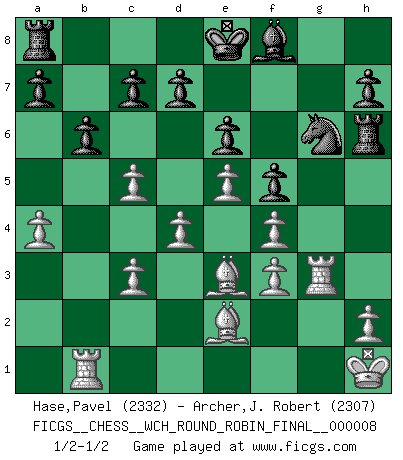 Last move : 1/2-1/2 2012 March 28 2:40:10 [Event "FICGS__CHESS__WCH_ROUND_ROBIN_FINAL__000008"] [Site "FICGS"] [Date "2012.01.02"] [Round "1"] [White "Hase,Pavel"] [Black "Archer,J. Robert"] [Result "1/2-1/2"] [WhiteElo "2332"] [BlackElo "2307"] 1.d4 Nf6 2.c4 e6 3.Nc3 Bb4 4.Nf3 b6 5.e3 Bb7 6.Bd3 Ne4 7.Qc2 f5 8.O-O Nxc3 9.bxc3 Bxf3 10.gxf3 Bd6 11.e4 Qh4 12.e5 Be7 13.Kh1 Nc6 14.Rg1 g5 15.Qe2 Rg8 16.Rb1 Rg6 17.Rg2 Qh5 18.f4 Qxe2 19.Bxe2 g4 20.Rg1 Bf8 21.a4 Rh6 22.Be3 Ne7 23.f3 g3 24.Rxg3 Ng6 25.c5 1/2-1/2 Nimzo-Indian : Three knights variation Kingside Castling by player White (move 8) This chess game ended in a draw. Follow this game move after move (download)Methodical thinking is of more use in Chess than inspiration. (C. J. S. Purdy) Schon mancher Spieler hat aufgegeben, um zu vermeiden, daß er eine Figur verliert. (Savielly Grigorievitsch Tartakower) En el Ajedrez, tal como en la vida, las bendiciones de hoy pueden ser el veneno del mañana. (Assaic) Je fais ceci parce que dans cinquante coups j'obtiendrai cela; je m'appelle Mikhail Moisevitch Botvinnik. (Botvinnik) Be who you are, and say what you feel because those who mind don't matter, and those who matter don't mind. (Dr Seuss)