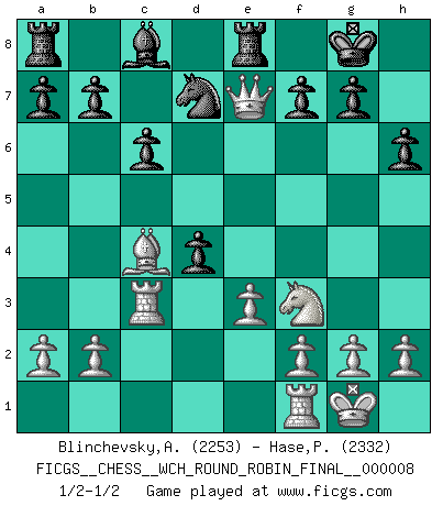 Last move : 1/2-1/2 2012 January 29 22:52:30 [Event "FICGS__CHESS__WCH_ROUND_ROBIN_FINAL__000008"] [Site "FICGS"] [Date "2012.01.02"] [Round "1"] [White "Blinchevsky,Alexander"] [Black "Hase,Pavel"] [Result "1/2-1/2"] [WhiteElo "2253"] [BlackElo "2332"] 1.d4 d5 2.c4 e6 3.Nc3 Nf6 4.Bg5 Be7 5.Nf3 O-O 6.e3 h6 7.Bh4 Ne4 8.Bxe7 Qxe7 9.Rc1 c6 10.Bd3 Nxc3 11.Rxc3 Nd7 12.Qc2 dxc4 13.Bxc4 e5 14.Qe4 Re8 15.O-O exd4 16.Qxe7 1/2-1/2 QGD : 4.Bg5 Be7 Kingside Castling by player Black (move 5) Kingside Castling by player White (move 15) This chess game ended in a draw. Follow this game move after move (download)A great player and a great example for many. His book My 60 Memorable Games had a big impact on me. It is a shame he didn't continue to enrich the world of chess with his unparalleled understanding after 1972. (Jan Timman, about Bobby Fischer's death) Ich bin es gewohnt, das die Jugend mir überhaupt keinen Respekt entgegenbringt. (Alexander Morozewich) El Ajedrez te enseña a controlarl la excitación inicial que sientes cuando vez algo que parece bueno y te enseña a pensar objetivamente cuando te encuentras en problemas. (Stanley Kubrick) On entre au jeu d'Echecs comme on entre en Religion. Pour le joueur d'Echecs, la partie d'Echecs c'est l'office, la messe, le défilé du 1er Mai, le dépôt de gerbe au Monument aux Morts. C'est un drame sacré. (Michel Roos) Internal peace cannot coexist with external war. (Don Groves)