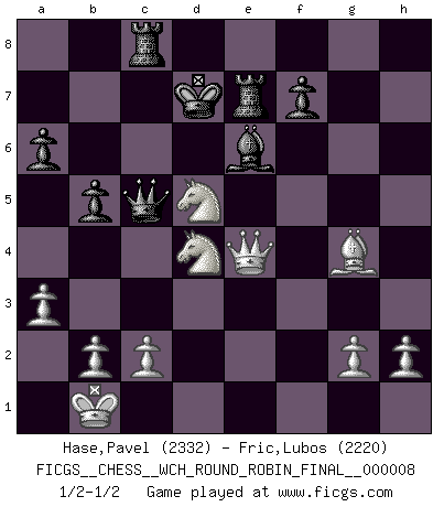 Last move : 1/2-1/2 2012 April 16 12:38:39 [Event "FICGS__CHESS__WCH_ROUND_ROBIN_FINAL__000008"] [Site "FICGS"] [Date "2012.01.02"] [Round "1"] [White "Hase,Pavel"] [Black "Fric,Lubos"] [Result "1/2-1/2"] [WhiteElo "2332"] [BlackElo "2220"] 1.e4 c5 2.Nf3 d6 3.d4 cxd4 4.Nxd4 Nf6 5.Nc3 a6 6.Bg5 e6 7.Qd2 h6 8.Bxf6 Qxf6 9.O-O-O Nc6 10.Nb3 Qd8 11.Kb1 Bd7 12.f4 Qc7 13.a3 Be7 14.Be2 b5 15.Rhf1 O-O 16.f5 Ne5 17.f6 Bxf6 18.Rxf6 gxf6 19.Qxh6 Rfc8 20.Rd3 Nxd3 21.Bxd3 d5 22.Nd4 Qc5 23.exd5 f5 24.Qg5+ Kf8 25.Qf6 exd5 26.Bxf5 Rc6 27.Qh8+ Ke7 28.Qe5+ Be6 29.Nce2 Re8 30.Nf4 Kd7 31.Nxd5 R6c8 32.Bg4 Re7 33.Qe4 1/2-1/2 Sicilian : Najdorf, 6...e6 Queenside Castling by player White (move 9) Kingside Castling by player Black (move 15) This chess game ended in a draw. Follow this game move after move (download)On the chessboard, lies and hypocrisy do not survive long. (Emanuel Lasker) Das Blackmar-Diemer-Gambit verändert den ganzen Menschen! (Emil Joseph Diemer) A la fecha, Fischer esta simplemente un nivel arriba de todos los mejores jugadores de Ajedrez del mundo. (John Jacobs) Je crois qu'il existe des manières très spécifiques de jouer efficacement contre une machine. Evidemment, nous n'avons aucune chance en technique pure, parce que l'ordinateur calcule de manière parfaite. Mais lorsque nous faisons appel à notre cerveau, en utilisant l'intuition et la compréhension, alors nous restons beaucoup plus forts. (Anatoli Karpov) Panic is a sudden desertion of us, an a going over to the enemy of our imagination. (Christian Nevell Bovee)