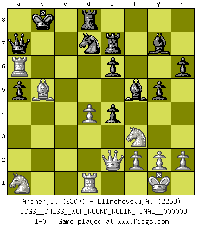 Last move : 1-0 2012 May 17 19:16:4 [Event "FICGS__CHESS__WCH_ROUND_ROBIN_FINAL__000008"] [Site "FICGS"] [Date "2012.01.02"] [Round "1"] [White "Archer,J. Robert"] [Black "Blinchevsky,Alexander"] [Result "1-0"] [WhiteElo "2307"] [BlackElo "2253"] 1.e4 c6 2.d4 d5 3.e5 Bf5 4.Nf3 e6 5.Be2 Nd7 6.O-O Ne7 7.Nbd2 h6 8.Nb3 Qc7 9.Bd2 g5 10.a4 O-O-O 11.Ba5 b6 12.Bd2 a5 13.c4 dxc4 14.Bxc4 Bg7 15.Rc1 Kb8 16.Qe2 Rhg8 17.Rfd1 Rge8 18.Na1 f6 19.b4 axb4 20.Bxb4 fxe5 21.a5 bxa5 22.Bxe7 Rxe7 23.Bb5 e4 24.Rxc6 Qa7 25.Ra6 1-0 Caro-Kann : Advance variation Kingside Castling by player White (move 6) Queenside Castling by player Black (move 10) Player White won this chess game. Follow this game move after move (download)No one ever won a game by resigning. (Unknown) Es ist nicht das erste mal, dass sich die FIDE dem Arabischen Geld gebeugt hat (über die FIDE WM 2004 in Lybien). (Larry Evans) Por la belleza de sus partidas, la claridad de su juego y lo brillante de sus ideas, Fischer se creó el mismo como un artista de la misma estatura como Brahms, Rembrandt y Shakespeare. (David Levy) Ce n'est pas pour s'amuser qu'il joue aux échecs : il célèbre un culte. (Vladimir Nabokov) Games, world of games... There's always an opponent, and there's always a victim. (Revolver, movie)