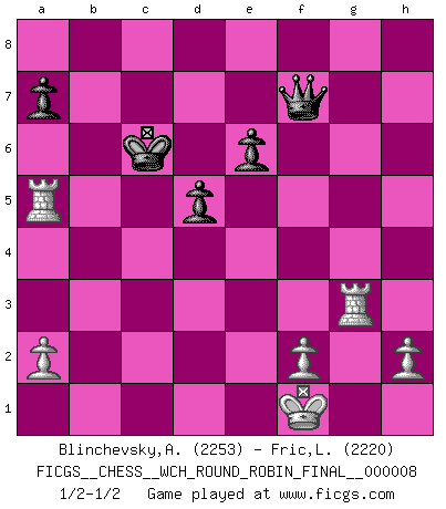 Last move : 1/2-1/2 2012 June 10 2:36:8 [Event "FICGS__CHESS__WCH_ROUND_ROBIN_FINAL__000008"] [Site "FICGS"] [Date "2012.01.02"] [Round "1"] [White "Blinchevsky,Alexander"] [Black "Fric,Lubos"] [Result "1/2-1/2"] [WhiteElo "2253"] [BlackElo "2220"] 1.d4 d5 2.c4 c6 3.Nf3 Nf6 4.Nc3 e6 5.Bg5 dxc4 6.e4 b5 7.e5 h6 8.Bh4 g5 9.Nxg5 hxg5 10.Bxg5 Nbd7 11.g3 Bb7 12.Bg2 Qb6 13.exf6 O-O-O 14.O-O Ne5 15.dxe5 Rxd1 16.Rfxd1 b4 17.Ne4 c5 18.Rdc1 Bd5 19.Nd2 Rh5 20.Bf4 Qc6 21.Bf1 Rf5 22.Bxc4 Qd7 23.Re1 Rxf4 24.gxf4 Bh6 25.Rad1 Bxf4 26.Nb3 Qd8 27.Bxd5 exd5 28.Kg2 c4 29.Nc5 c3 30.bxc3 bxc3 31.e6 fxe6 32.f7 Qg5+ 33.Kf1 Qf5 34.Rd3 Bd6 35.Rxc3 Bxc5 36.Rxc5+ Kd7 37.Re3 Qb1+ 38.Kg2 Qg6+ 39.Rg3 Qxf7 40.Ra5 Kc6 41.Kf1 1/2-1/2 QGD Slav : 4.Nc3 Queenside Castling by player Black (move 13) Kingside Castling by player White (move 14) This chess game ended in a draw. Follow this game move after move (download)He who takes the Queen's Knight's Pawn will sleep in the streets. (Anonymous) Die Neutralität betrachte ich als eine schwere Krankheit. (Viktor Kortschnoi) Diferente gente reacciona diferentemente en aceptar la derrota. (Bobby Fischer) Mais l'homme est une créature légère et illogique : semblable au joueur d'échecs, il n'aime que le processus du but à atteindre, non le but lui-même. (Dostoïevsky) Waiting for chance ? Play in casinos. (FICGS proverb)