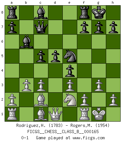 Last move : 0-1 2012 April 13 1:34:50 [Event "FICGS__CHESS__CLASS_B__000165"] [Site "FICGS"] [Date "2012.01.03"] [Round "1"] [White "Rodriguez,Henderb"] [Black "Rogers,Michael"] [Result "0-1"] [WhiteElo "1783"] [BlackElo "1954"] 1.Nf3 c5 2.c3 d5 3.d4 e6 4.e3 Nc6 5.Bd3 Nf6 6.Nbd2 Be7 7.O-O O-O 8.dxc5 Bxc5 9.Nb3 Bb6 10.Nbd4 Qc7 11.b3 e5 12.Nxc6 bxc6 13.Bc2 e4 14.Nd4 Ng4 15.g3 c5 16.Ne2 Ne5 0-1 Reti Opening Kingside Castling by player White (move 7) Kingside Castling by player Black (move 7) Player Black won this chess game. Follow this game move after move (download)The King is a fighting piece. Use it ! (Wilhelm Steinitz) Schach ist die gewalttätigste aller Sportarten. (Garry Kasparov) La vida es como el Ajedrez, con lucha, competición y eventos buenos y malos. (Benjamin Franklin) Seul un grand joueur sait à quel point il joue faiblement. (Xavier Tartacover) Never was anything great achieved without danger. (Niccolo Machiavelli)
