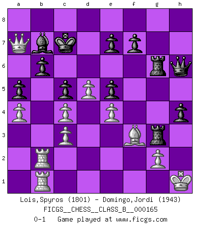 Last move : 0-1 2012 February 13 13:56:34 [Event "FICGS__CHESS__CLASS_B__000165"] [Site "FICGS"] [Date "2012.01.03"] [Round "1"] [White "Lois,Spyros"] [Black "Domingo,Jordi"] [Result "0-1"] [WhiteElo "1801"] [BlackElo "1943"] 1.e4 h6 2.d4 c5 3.d5 d6 4.c4 g5 5.Nf3 Bg7 6.Be2 Nd7 7.Nc3 Bxc3+ 8.bxc3 Ngf6 9.Qc2 Qa5 10.O-O g4 11.Nh4 Ne5 12.f4 gxf3 13.Nxf3 Qc7 14.Nxe5 dxe5 15.Qd3 Qd6 16.Rb1 b6 17.a4 a5 18.h3 Bd7 19.Bd1 Kd8 20.Be3 Kc7 21.Qc2 Rag8 22.Kh1 h5 23.Be2 Rh7 24.Bf2 Rhg7 25.Rg1 Ng4 26.Rgf1 Nxf2+ 27.Rxf2 Rg3 28.Qb3 Bxh3 29.Bf3 Qh6 30.Qb5 R8g6 31.Qa6 Bc8 32.Qa7+ Bb7 33.Rfb2 h4 0-1 Carr's defense Kingside Castling by player White (move 10) Player Black won this chess game. Follow this game move after move (download)The enormous mental resilience, without which no Chess player can exist, was so much taken up by Chess that he could never free his mind of this game. (Albert Einstein) Nie in meinem Leben habe ich die französische Verteidigung gespielt, welche die Stumpfsinnigste von allen ist. (Wilhelm Steinitz) Me gusta decir que Bobby Fischer fue el mejor jugador que jamás haya existido. Pero lo que hizo de Fischer un genio, fue su habilidad de mezclar una frescura y pragmatismo Americano con ideas Rusas acerca de la estrategia. (Bruce Pandolfini) Les Echecs ont trois composantes : le temps, l'espace et le matériel en dernier. (Mikhail Tal) Remember : Your focus determines your reality. (Qui-Gon Jinn in Star Wars ep.1)