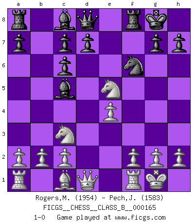 Last move : 1-0 2012 February 26 1:51:0 [Event "FICGS__CHESS__CLASS_B__000165"] [Site "FICGS"] [Date "2012.01.03"] [Round "1"] [White "Rogers,Michael"] [Black "Pech,Jaroslav senior"] [Result "1-0"] [WhiteElo "1954"] [BlackElo "1583"] 1.e4 e5 2.Nf3 Nc6 3.Bb5 f5 4.d3 fxe4 5.dxe4 Nf6 6.O-O Bc5 7.Bxc6 bxc6 8.Nxe5 O-O 9.Nc3 1-0 This chess game has been lost on time (started : 2012.01.03 2:19:30) Ruy Lopez : Schliemann defense Kingside Castling by player White (move 6) Kingside Castling by player Black (move 8) Player White won this chess game. Follow this game move after move (download)The isolated Pawn casts gloom over the entire chessboard. (Aaron Nimzovich) Der Verteidiger gebe der Gewalt nach, aber nur der Gewalt. Er schaffe sich nicht freiwillig, etwa aus Blindheit oder aus Schrecken, irgendwelche Schwächen. Er lasse sich nicht bluffen. (Emanuel Lasker) Solo existe una cosa que Fischer hace en el Ajedrez sin placer: ¡perder!. (Boris Spassky) C'est une question de caractère, Beaucoup de gens perdent leur motivation très vite. D'autres, ils sont rares, peuvent la conserver très longtemps. J'aime les échecs, encore aujourd'hui je suis heureux d'analyser des parties. J'aime toujours gagner, je déteste encore perdre. Bien jouer est important pour mon intégrité intellectuelle et morale. Et puis les échecs vivent en ce moment une période historique grâce à Internet. Ils se développent dans les systèmes éducatifs à travers le monde. Ils sortent de leur ghetto, et c'est mon rôle de mener à bien cette révolution. (Gary Kasparov) Industry executives and analysts often mistakenly talk about strategy as if it were some kind of chess match. But in chess, you have just two opponents, each with identical resources, and with luck playing a minimal role. The real world is much more like a poker game, with multiple players trying to make the best of whatever hand fortune has dealt them. In our industry, Bill Gates owns the table until someone proves otherwise. (David Moschella, 'Computerworld')