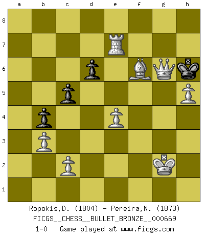 Last move : 1-0 2012 January 3 19:54:57 [Event "FICGS__CHESS__BULLET_BRONZE__000669"] [Site "FICGS"] [Date "2012.01.03"] [Round "1"] [White "Ropokis,Dimitrios"] [Black "Pereira,Nilson"] [Result "1-0"] [WhiteElo "1804"] [BlackElo "1873"] 1.e4 c5 2.Nc3 d6 3.f4 Nc6 4.Nf3 g6 5.Bb5 Bd7 6.O-O Bg7 7.d3 Nf6 8.Bd2 a6 9.Bxc6 Bxc6 10.Qe1 O-O 11.b3 b5 12.Rd1 b4 13.Ne2 a5 14.f5 a4 15.fxg6 hxg6 16.Ng5 axb3 17.Qh4 Re8 18.axb3 Ra2 19.Rc1 Qd7 20.Rf3 Rb2 21.Rh3 Qc8 22.Nh7 Ng4 23.Ng5 Nf6 24.Rg3 Ra2 25.Nf4 Bb7 26.Be3 Qd7 27.Nge6 R2a8 28.Nxg7 Kxg7 29.Nxg6 fxg6 30.Qh6+ Kf7 31.Qxg6+ Ke6 32.Rf1 Ra1 33.Rxa1 Qc8 34.Rf3 Rg8 35.Qf5+ Kf7 36.Qh5+ Ke6 37.Qh3+ Kf7 38.Rf5 Rg6 39.Bg5 Kg8 40.Qh4 Nh7 41.Bxe7 Rxg2+ 42.Kxg2 Qxf5 43.Qg3+ Ng5 44.Bxg5 Qg6 45.Ra7 Bc6 46.h4 Kh8 47.h5 Qe6 48.Re7 Qf5 49.Bh6 Bxe4+ 50.dxe4 Qf6 51.Bg7+ Kh7 52.Bxf6 Kh6 53.Qg6+ 1-0 Sicilian : Closed Kingside Castling by player White (move 6) Kingside Castling by player Black (move 10) Player White won this chess game. Follow this game move after move (download)For surely of all the drugs in the world, Chess must be the most permanently pleasurable. (Assiac) Schach wird sich dank seiner hohen kulturellen Tradition immer durchsetzen. In näherer Zukunft womöglich sogar als Gegenreaktion auf die maßlose Reizüberflutung im Freizeit- und Spielbereich. (Garry Kasparov) Tu puedes aprender mucho mas de una partida que pierdas que de una partida ganada. Tendras que perder cientos de partidas antes de llegar a ser un buen jugador. (Jose Raul Capablanca) La conception d'un plan est le processus par lequel un joueur exploite les avantages de sa position tout en s'efforçant d'en réduire au minimum les inconvénients. Afin de garantir le succès, un plan doit toujours se fonder sur un diagnostic objectif des particularités d'une position. La conception d'un plan est d'autant plus difficile que la position est équilibrée, et grandement facilitée lorsqu'il n'existe qu'un seul plan susceptible de répondre aux exigences de la position. (Harry Golombek) In God we trust, all others we virus scan. (Anonymous)