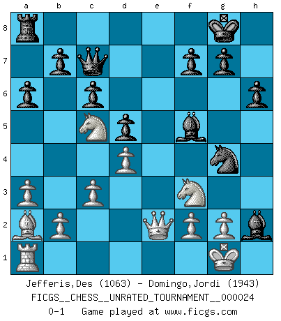 Last move : 0-1 2012 February 23 19:9:32 [Event "FICGS__CHESS__UNRATED_TOURNAMENT__000024"] [Site "FICGS"] [Date "2012.01.03"] [Round "1"] [White "Jefferis,Des"] [Black "Domingo,Jordi"] [Result "0-1"] [WhiteElo "1063"] [BlackElo "1943"] 1.e4 h6 2.Nf3 a6 3.Bc4 e6 4.d4 d5 5.exd5 exd5 6.Bb3 Be6 7.O-O Bd6 8.c3 Nf6 9.Re1 O-O 10.Nbd2 Re8 11.a3 Nbd7 12.Ba2 Bf5 13.Nb3 Rxe1+ 14.Qxe1 c6 15.Be3 Qc7 16.Qd2 Nb6 17.Nc5 Nc4 18.Qe2 Nxe3 19.Qxe3 Ng4 20.Qe2 Bxh2+ 0-1 Carr's defense Kingside Castling by player White (move 7) Kingside Castling by player Black (move 9) Player Black won this chess game. Follow this game move after move (download)The most powerful weapon in Chess is to have the next move. (David Bronstein) Warum muß ich gegen diesen IDIOTEN verlieren? (Aaron Nimzowitsch) La vida es como el Ajedrez, con lucha, competición y eventos buenos y malos. (Benjamin Franklin) Que feriez-vous si vous étiez en train de jouer aux échecs et que la fin du monde arrive ? Je continuerais à jouer. (Saint Borromée) Always remember that you are unique; just like everyone else. (Unknown)