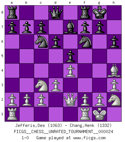 Last move : 1-0 2012 April 12 23:35:1 [Event "FICGS__CHESS__UNRATED_TOURNAMENT__000024"] [Site "FICGS"] [Date "2012.01.03"] [Round "1"] [White "Jefferis,Des"] [Black "Chang,Henk"] [Result "1-0"] [WhiteElo "1063"] [BlackElo "1332"] 1.e4 e5 2.Nf3 Nf6 3.d3 Nc6 4.Bg5 Be7 5.Nc3 O-O 6.Be2 d6 7.O-O h6 8.Bh4 Bg4 9.h3 Bh5 10.Nh2 Bxe2 11.Qxe2 1-0 Petrov's defense Kingside Castling by player Black (move 5) Kingside Castling by player White (move 7) Player White won this chess game. Follow this game move after move (download)Castle early and often. (Rob Sillars) Es ist nicht das erste mal, dass sich die FIDE dem Arabischen Geld gebeugt hat (über die FIDE WM 2004 in Lybien). (Larry Evans) Repentinamente, me resultaba obvio en mi analisis que yo había pasado por alto lo que Fischer había visto en el tablero con la mas grande facilidad. (Mikhail Botvinnik) Il a essayé de se convaincre qu'il pourrait empêcher toutes les erreurs et ne jamais perdre. L'horreur ! Gary Kasparov au sujet de Robert Fischer. There is far too much law for those who can afford it and far too little for those who cannot. (Derek Bok)