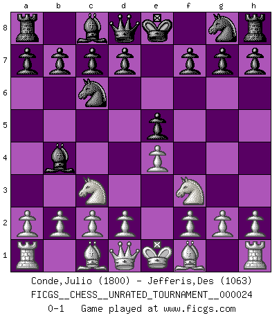 Last move : 0-1 2012 March 3 8:9:0 [Event "FICGS__CHESS__UNRATED_TOURNAMENT__000024"] [Site "FICGS"] [Date "2012.01.03"] [Round "1"] [White "Conde,Julio"] [Black "Jefferis,Des"] [Result "0-1"] [WhiteElo "1800"] [BlackElo "1063"] 1.e4 e5 2.Nf3 Nc6 3.Nc3 Bb4 0-1 This chess game has been lost on time (started : 2012.01.03 19:34:56) Three knights game Player Black won this chess game. Follow this game move after move (download)With or without the title, Bobby Fischer was unquestionably the greatest player of his time. (Burt Hochberg) Im Schach gewinnt jeder. Hat man Freunde am Spiel - und das ist die Hauptsache - ist auch der Verlust einer Partie kein Unglück. (David Bronstein) El jugador de combinación piensa hacia adelante; comienza de la posición dada y trabaja las movidas contundentes en su mente. (Emanuel Lasker) Toutes les manuvres exécutées sur une colonne ouverte ont pour but ultime l'intrusion définitive sur la septième ou la huitième rangée, en plein cur de la position ennemie. (Aaron Nimzovitch) Rules and bones are meant to be broken. (Anonymous)