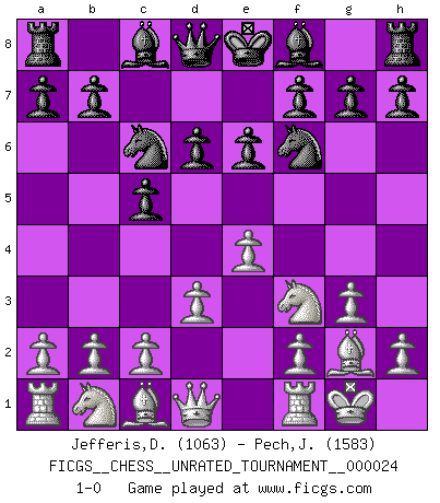Last move : 1-0 2012 April 1 12:19:55 [Event "FICGS__CHESS__UNRATED_TOURNAMENT__000024"] [Site "FICGS"] [Date "2012.01.03"] [Round "1"] [White "Jefferis,Des"] [Black "Pech,Jaroslav senior"] [Result "1-0"] [WhiteElo "1063"] [BlackElo "1583"] 1.e4 c5 2.Nf3 e6 3.g3 Nc6 4.Bg2 Nf6 5.d3 d6 6.O-O 1-0 Sicilian defense Kingside Castling by player White (move 6) Player White won this chess game. Follow this game move after move (download)I am the best player in the world and I am here to prove it. (Bobby Fischer) Du weisst es gibt ein Problem mit Computern und Fernschach, wenn jeder eine Rating von 2450 hat. (John Christen Knudsen) La pasion por jugar al Ajedrez es una de las mas inexplicables en el mundo. (H.G. Wells) Le pion, dans sa simplicité, marche droit devant lui, mais lorsqu'il prend, il le fait obliquement? Ainsi l'homme, tant qu'il reste pauvre, marche dans la droiture et vit honnêtement, mais lorsqu'il recherche les honneurs, il flatte, se parjure et, par les voies obliques, cherche une position supérieure sur l'échiquier du monde. (Jean de Galles) The message for business people contemplating their place in the cyberspace is simple and direct: get linked or get lost. (Vic Sussman and Kenan Pollack)