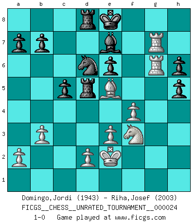 Last move : 1-0 2012 January 28 22:35:6 [Event "FICGS__CHESS__UNRATED_TOURNAMENT__000024"] [Site "FICGS"] [Date "2012.01.03"] [Round "1"] [White "Domingo,Jordi"] [Black "Riha,Josef"] [Result "1-0"] [WhiteElo "1943"] [BlackElo "2003"] 1.g4 d5 2.Bg2 Bxg4 3.c4 e6 4.Qb3 Ne7 5.cxd5 exd5 6.Nc3 Nbc6 7.Nxd5 Nxd5 8.Bxd5 Nd4 9.Qc4 Be6 10.Bxe6 fxe6 11.e3 Qg5 12.Kf1 Qb5 13.Qxb5+ Nxb5 14.b3 Bb4 15.Ke2 Rd8 16.f4 O-O 17.Nf3 Rd5 18.Bb2 Rfd8 19.Rad1 Be7 20.Rhg1 g6 21.Be5 c5 22.h4 Kf8 23.h5 gxh5 24.Rg2 Nd6 25.Rdg1 Ke8 26.Rg7 h6 27.R1g6 1-0 Grob : Fritz gambit Kingside Castling by player Black (move 16) Player White won this chess game. Follow this game move after move (download)The boy (then a 12 year old boy named Anatoly Karpov) doesn't have a clue about Chess, and there's no future at all for him in this profession. (Mikhail Botvinnik) Im Internet Chess Club betrug mein Rating vorübergehend 3350 ELO-Punkte. (Sergej Karjakin) El pensamiento metódico es mas útil en el Ajedrez que la inspiración. (C. J. S. Purdy) Même un GMI sait rarement calculer sur plus de cinq coups une attaque à sacrifices. (Rudolf Spielmann) Fear is the path to the dark side. Fear leads to anger; anger leads to hate; hate leads to suffering. I sense much fear in you. (Master Yoda in Star Wars ep.1)