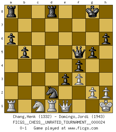 Last move : 0-1 2012 February 11 12:40:39 [Event "FICGS__CHESS__UNRATED_TOURNAMENT__000024"] [Site "FICGS"] [Date "2012.01.03"] [Round "1"] [White "Chang,Henk"] [Black "Domingo,Jordi"] [Result "0-1"] [WhiteElo "1332"] [BlackElo "1943"] 1.d4 h6 2.e4 c5 3.Nf3 cxd4 4.Nxd4 a6 5.Be3 Nf6 6.Nc3 e5 7.Nb3 Bb4 8.Bd3 d5 9.exd5 Nxd5 10.Bd2 Nxc3 11.bxc3 Bd6 12.O-O Nc6 13.Re1 Be6 14.Rb1 O-O 15.Be3 Qe7 16.Qe2 f5 17.Bc4 b5 18.Bxe6+ Qxe6 19.Bc5 Bxc5 20.Nxc5 Qd5 21.Nd3 e4 22.Nf4 Qxa2 23.Rb3 Na5 24.R3b1 Qf7 25.Ra1 Nc4 26.f3 g5 27.Nh3 e3 28.Kh1 Rfd8 29.Ng1 Qf6 30.Qf1 Qxc3 31.Ne2 Qxc2 32.Rec1 Qd3 33.Rd1 Nd2 34.Qe1 f4 35.Nc1 Qf5 0-1 Queen's pawn Kingside Castling by player White (move 12) Kingside Castling by player Black (move 14) Player Black won this chess game. Follow this game move after move (download)Chess is not like life... it has rules ! (Mark Pasternak) Um sich vor der Gefahr einer Erkältung zu schützen, sorge der wanderlustige König beizeiten für ein brauchbares Versteck. (Aaron Nimzowitsch) Peones: ellos son el alma de esta partida, solos forman el ataque y la defensa. (Philidor) Un footballeur joue avec ses pieds, parfois avec sa tête. Un joueur d'échecs ne joue qu'avec sa tête. Et quand il ne joue plus, il meurt. (Jacob Murray) Faith : not wanting to know what is true. (Friedrich Nietzsche)