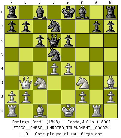 Last move : 1-0 2012 March 27 22:40:15 [Event "FICGS__CHESS__UNRATED_TOURNAMENT__000024"] [Site "FICGS"] [Date "2012.01.03"] [Round "1"] [White "Domingo,Jordi"] [Black "Conde,Julio"] [Result "1-0"] [WhiteElo "1943"] [BlackElo "1800"] 1.g4 d5 2.Bg2 Bxg4 3.c4 Nf6 4.Qb3 Bc8 5.cxd5 c6 6.Nc3 e5 7.dxe6 fxe6 8.d3 Qc7 9.Bh3 Qe5 10.Nf3 Qd6 11.Rg1 Nbd7 12.d4 Nd5 13.e4 1-0 Grob : Fritz gambit Player White won this chess game. Follow this game move after move (download)Chess is a cold bath for the mind. (Sir John Simon) Wie kann ich Remis annehmen? Ich weiß ja gar nicht, wie ich stehe! (Fritz Sämisch) Preferería tener un Peón que un dedo. (Reuben Fine) Il vaut toujours mieux jouer un plan faux de façon logique que de n'avoir pas de plan du tout. (Victor Kortchnoï) An expert is a man who has made all the mistakes which can be made in a very narrow field. (Niels Bohr)