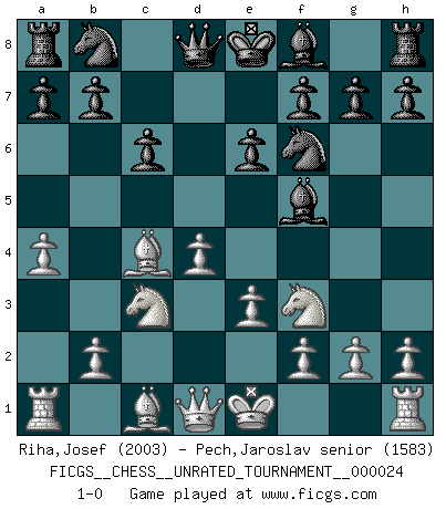 Last move : 1-0 2012 April 1 12:20:4 [Event "FICGS__CHESS__UNRATED_TOURNAMENT__000024"] [Site "FICGS"] [Date "2012.01.03"] [Round "1"] [White "Riha,Josef"] [Black "Pech,Jaroslav senior"] [Result "1-0"] [WhiteElo "2003"] [BlackElo "1583"] 1.d4 d5 2.c4 c6 3.Nf3 Nf6 4.Nc3 dxc4 5.a4 Bf5 6.e3 e6 7.Bxc4 1-0 QGD Slav : Dutch variation Player White won this chess game. Follow this game move after move (download)No other master has such a terrific will to win. At the board he radiates danger, and even the strongest opponents tend to freeze, like rabbits when they smell a panther. Even his weaknesses are dangerous. As white, his opening game is predictable - you can make plans against it - but so strong that your plans almost never work. In the middle game his precision and invention are fabulous, and in the end game you simply cannot beat him. (Anonymous German Expert) Frage des Reporters: -Welche besonderen Umstände rechtfertigen das Anhalten der Uhren während einer Turnierpartie? Antwort: -Einen Fotographen zu strangulieren. (Siegbert Tarrasch) Cada Peón es una Reina en potencia. (James Mason) Les échecs sont un jeu terrible. Si vous n'avez pas le centre, votre adversaire a une position plus libre. Par contre, si vous avez le centre, alors vous avez vraiment quelque chose pour laquelle vous inquiéter ! (Siegbert Tarrasch) The problem with manipulation is that people can turn on you. (Horatio Caine, C.S.I. Miami)