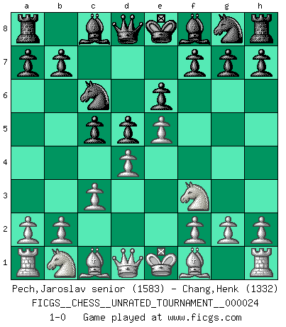 Last move : 1-0 2012 March 23 21:33:46 [Event "FICGS__CHESS__UNRATED_TOURNAMENT__000024"] [Site "FICGS"] [Date "2012.01.03"] [Round "1"] [White "Pech,Jaroslav senior"] [Black "Chang,Henk"] [Result "1-0"] [WhiteElo "1583"] [BlackElo "1332"] 1.e4 e6 2.d4 d5 3.e5 c5 4.c3 Nc6 5.Nf3 1-0 This chess game has been lost on time (started : 2012.01.03 19:34:56) French : Advance, Paulsen attack Player White won this chess game. Follow this game move after move (download)I'd rather have a Pawn than a finger. (Reuben Fine) Man kann eine Schachpartie nur gewinnen, wenn das Gleichgewicht gestört ist. In einer Stellung mit ungestörtem Gleichgewicht ist auch das größte Genie hilflos - in der Stellung steckt dann eben kein genialer Einfall. (Wilhelm Steinitz) La batalla por la última verdad nunca sera ganada. Y es por eso que el Ajedrez es tan fascinante. (Hans Kmoch) J'apprécie les joueurs d'est-indienne, c'est grâce à eux que je nourris ma famille depuis tant d'années. (Petrosian) I'll be back. (Arnold Schwarzenegger)