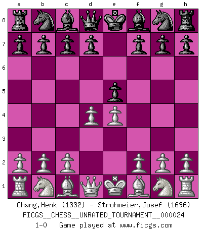 Last move : 1-0 2012 February 5 17:54:32 [Event "FICGS__CHESS__UNRATED_TOURNAMENT__000024"] [Site "FICGS"] [Date "2012.01.03"] [Round "1"] [White "Chang,Henk"] [Black "Strohmeier,Josef"] [Result "1-0"] [WhiteElo "1332"] [BlackElo "1696"] 1.e4 e5 2.d4 1-0 King's pawn game Player White won this chess game. Follow this game move after move (download)Not all artists are Chess players, but all Chess players are artists. (Marcel Duchamp) Ich möchte Schüler heranbilden, die das Vermögen haben, selbst zu denken und Kritik zu üben. (Emanuel Lasker) El Rey es una pieza de pelea. ¡Usenlo!. (Wilhelm Steinitz) Roi des jeux et jeu des rois, les échecs portent en eux un sentiment d'infini. Ils donnent à celui qui s'est efforcé d'en approfondir les arcanes l'impression de n'être pas à la mesure de l'homme; en fait, ils constituent un résumé de l'univers, un microcosme, et figurent cette grande échelle qui, dans les plans de la lumière descend jusqu'à la matière, qui des abîmes insondables remonte jusqu'en l'infini de Dieu. (Pyrame) Even the best needles are not sharp at both ends. (Chinese proverb)