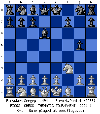 Last move : 0-1 2012 February 17 19:45:32 [Event "FICGS__CHESS__THEMATIC_TOURNAMENT__000141"] [Site "FICGS"] [Date "2012.01.07"] [Round "1"] [White "Biryukov,Sergey"] [Black "Parmet,Daniel"] [Result "0-1"] [WhiteElo "1494"] [BlackElo "2083"] 1.f4 e5 2.fxe5 d6 3.exd6 Bxd6 4.Nf3 g5 0-1 This chess game has been lost on time (started : 2012.01.07 10:14:3) Bird : From gambit, Lasker variation Player Black won this chess game. Follow this game move after move (download)If your opponent cannot do anything active, then don't rush the position; instead you should let him sit there, suffer, and beg you for a draw. (Jeremy Silman) Aljechin war kein Nazi. Er war ein Opportunist. Ein schrecklicher Mann. Er liebte Geld über alles und würde für Geld ein Jude, ein Katolik oder ein Protestant werden. (Miguel Najdorf) Nada excita más a Grandes Maestros aburridos que una novedad teórica. (Dominic Lawson) Toutes les manuvres exécutées sur une colonne ouverte ont pour but ultime l'intrusion définitive sur la septième ou la huitième rangée, en plein cur de la position ennemie. (Aaron Nimzovitch) How many people work in NATO Headquarters ? - About half of them. (Dirk Stikker, NATO general secretary)