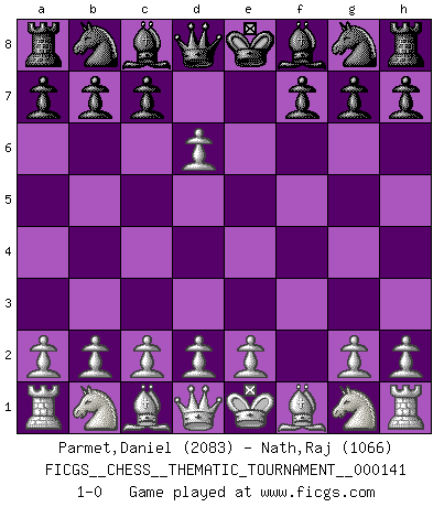 Last move : 1-0 2012 February 16 19:46:31 [Event "FICGS__CHESS__THEMATIC_TOURNAMENT__000141"] [Site "FICGS"] [Date "2012.01.07"] [Round "1"] [White "Parmet,Daniel"] [Black "Nath,Raj"] [Result "1-0"] [WhiteElo "2083"] [BlackElo "1066"] 1.f4 e5 2.fxe5 d6 3.exd6 1-0 This chess game has been lost on time (started : 2012.01.07 10:14:3) Bird : From gambit Player White won this chess game. Follow this game move after move (download)On the chessboard, lies and hypocrisy do not survive long. (Emanuel Lasker) Der Verteidiger gebe der Gewalt nach, aber nur der Gewalt. Er schaffe sich nicht freiwillig, etwa aus Blindheit oder aus Schrecken, irgendwelche Schwächen. Er lasse sich nicht bluffen. (Emanuel Lasker) Bobby Fischer es el jugador de Ajedrez mas grande que jamás haya existido. (Ken Smith) Le pion, dans sa simplicité, marche droit devant lui, mais lorsqu'il prend, il le fait obliquement? Ainsi l'homme, tant qu'il reste pauvre, marche dans la droiture et vit honnêtement, mais lorsqu'il recherche les honneurs, il flatte, se parjure et, par les voies obliques, cherche une position supérieure sur l'échiquier du monde. (Jean de Galles) I find your interest interesting. (Gregory House, House M.D.)