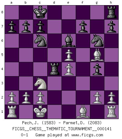 Last move : 0-1 2012 May 23 1:57:42 [Event "FICGS__CHESS__THEMATIC_TOURNAMENT__000141"] [Site "FICGS"] [Date "2012.01.07"] [Round "1"] [White "Pech,Jaroslav senior"] [Black "Parmet,Daniel"] [Result "0-1"] [WhiteElo "1583"] [BlackElo "2083"] 1.f4 e5 2.fxe5 d6 3.exd6 Bxd6 4.Nf3 g5 5.d4 g4 6.Ne5 Bxe5 7.dxe5 Qxd1+ 8.Kxd1 Nc6 9.Nc3 Be6 10.Bf4 O-O-O 11.Kc1 Nge7 12.e4 Ng6 13.Bg5 Rd4 0-1 This chess game has been lost on time (started : 2012.01.07 10:14:3) Bird : From gambit, Lasker variation Queenside Castling by player Black (move 10) Player Black won this chess game. Follow this game move after move (download)Don't even mention losing to me. I can't stand to think of it. (Bobby Fischer) Ich verachte Kasparow. (Viktor Kortschnoi) Fischer deseaba darle a los Rusos una sopa de su propia medicina. (Larry Evans) Les Echecs représentent une sphère d'idées créatrices basée sur la volonté des deux protagonistes. (Smyslov) Luck never gives; it only lends. (Swedish proverb)