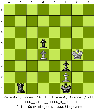 Last move : 0-1 2006 November 13 19:25:3 [Event "FICGS__CHESS__CLASS_D__000004"] [Site "FICGS"] [Date "2006.05.11"] [Round "1"] [White "Valentin,Florea"] [Black "Clement,Etienne"] [Result "0-1"] [WhiteElo "1400"] [BlackElo "1600"] 1.e4 e6 2.d4 d5 3.Nd2 Be7 4.Bd3 c5 5.dxc5 Nf6 6.Ngf3 O-O 7.O-O a5 8.c3 Nc6 9.Qc2 Qc7 10.exd5 exd5 11.Nb3 Bg4 12.Nfd4 a4 13.Nxc6 bxc6 14.Nd4 Bh5 15.g3 Bxc5 16.Bg5 Bg6 17.Bxf6 gxf6 18.Rfe1 Rfb8 19.Nf5 Qa7 20.b4 axb3 21.Qd2 b2 22.Rab1 Qd7 23.Qf4 Bd6 24.Qg4 Qd8 25.Re2 Rxa2 26.Kg2 Be5 27.Rc2 Rb3 28.Nd4 Bxd4 29.Bxg6 hxg6 30.cxd4 Kg7 31.h4 Qe7 32.Re2 Qd6 33.h5 f5 34.Qg5 Rb7 35.Qh4 Rb8 36.Qg5 Rb3 37.Re8 f4 38.hxg6 f3 39.Kh2 Qxg6 40.Qe5+ Qf6 41.Rg8+ Kxg8 42.Qxf6 Ra1 43.Qf5 Rxb1 44.Qxb1 f5 45.Kh3 Kg7 46.Kh4 Kf6 47.g4 fxg4 48.Kxg4 Ke7 49.Kf5 Kd6 50.Kf4 Kc7 51.Ke5 Kb6 52.Kf4 Kb5 53.Kf5 Kb4 54.Kf4 Ka3 55.Kg4 Rc3 56.Qe1 Rc1 57.Qa5+ Kb3 58.Qb6+ Kc2 59.Qxc6+ Kd2 60.Qh6+ Kd1 61.Qh1+ Kc2 62.Qh7+ Kc3 63.Qc7+ Kd3 64.Qh7+ Ke2 65.Qe7+ Kf1 66.Qh7 b1=Q 67.Qxb1 Rxb1 0-1 French : Tarrasch Kingside Castling by player Black (move 6) Kingside Castling by player White (move 7) 10 pieces endgame at move 48 : White KQPP , Black KRPPPP WHITE : King + 1 Queen 2 Pawns BLACK : King + 1 Rook 4 Pawns 9 pieces endgame at move 59 : White KQPP , Black KRPPP WHITE : King + 1 Queen 2 Pawns BLACK : King + 1 Rook 3 Pawns Promotion Queen by player Black (move 66) 8 pieces endgame at move 67 : White KQPP , Black KRPP WHITE : King + 1 Queen 2 Pawns BLACK : King + 1 Rook 2 Pawns 7 pieces endgame at move 67 : White KPP , Black KRPP WHITE : King + 2 Pawns BLACK : King + 1 Rook 2 Pawns Player Black won this chess game. Follow this game move after move (download)As one by one I mowed them down, my superiority soon became apparent. (Jose Capablanca) Bis jetzt ist Weiß einer wohlbekannten Analyse gefolgt. Aber jetzt begeht er einen schrecklichen Fehler: Er beginnt seinen eigenen Kopf zu benutzen. (Siegbert Tarrasch) El Ajedrez es tan inspirador que yo no creo que un buen jugador sea capaz de tener un pensamiento malo durante una partida. (Wilhelm Steinitz) On n'a jamais que l'âge auquel on a commence à jouer aux échecs car après on cesse de vieillir. (Capablanca) Internet: Absolute communication, absolute isolation. (Paul Carvel)