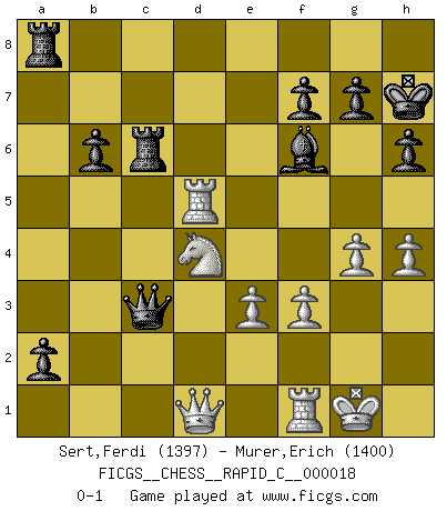 Last move : 0-1 2007 February 2 19:32:39 [Event "FICGS__CHESS__RAPID_C__000018"] [Site "FICGS"] [Date "2007.01.15"] [Round "1"] [White "Sert,Ferdi"] [Black "Murer,Erich"] [Result "0-1"] [WhiteElo "1397"] [BlackElo "1400"] 1.d4 d5 2.Nf3 Nf6 3.c4 e6 4.Nc3 Be7 5.Bg5 O-O 6.e3 h6 7.Bxf6 Bxf6 8.cxd5 exd5 9.Bd3 c5 10.O-O cxd4 11.Nxd4 Nc6 12.Nce2 Qb6 13.Rc1 Nxd4 14.Nxd4 Qxb2 15.Rb1 Qxa2 16.Bf5 b6 17.Bxc8 Rfxc8 18.Nf5 Rc6 19.Qg4 Kh7 20.h4 Qc4 21.Qf3 a5 22.g4 Qe4 23.Qd1 a4 24.f3 Qe5 25.Rb5 a3 26.Rxd5 Qc3 27.Nd4 a2 0-1 Queen's pawn game Kingside Castling by player Black (move 5) Kingside Castling by player White (move 10) Player Black won this chess game. Follow this game move after move (download)Good positions don't win games, good moves do. (Gerald Abrahams) Ein guter Spieler hat immer Glück. (José Raúl Capablanca) El Ajedrez es una hermosa aventura. (Bent Larsen) Je crois qu'il existe des manières très spécifiques de jouer efficacement contre une machine. Evidemment, nous n'avons aucune chance en technique pure, parce que l'ordinateur calcule de manière parfaite. Mais lorsque nous faisons appel à notre cerveau, en utilisant l'intuition et la compréhension, alors nous restons beaucoup plus forts. (Anatoli Karpov) CHESS, n. f. [echecs, Fr.] A nice and abstruse game, in which two sets of puppets are moved in opposition to each other. (Dr Samuel Johnson, A Dictionary Of The English Language, 1755)