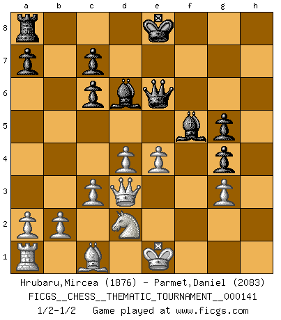 Last move : 1/2-1/2 2012 February 27 1:20:13 [Event "FICGS__CHESS__THEMATIC_TOURNAMENT__000141"] [Site "FICGS"] [Date "2012.01.07"] [Round "1"] [White "Hrubaru,Mircea"] [Black "Parmet,Daniel"] [Result "1/2-1/2"] [WhiteElo "1876"] [BlackElo "2083"] 1.f4 e5 2.fxe5 d6 3.exd6 Bxd6 4.Nf3 g5 5.g3 g4 6.Nh4 Ne7 7.d4 Ng6 8.Ng2 h5 9.Qd3 Nc6 10.c3 h4 11.Nf4 Qf6 12.Nxg6 fxg6 13.Bg2 hxg3 14.hxg3 Rxh1+ 15.Bxh1 Bf5 16.Bxc6+ bxc6 17.e4 Qe6 18.Nd2 g5 1/2-1/2 Bird : From gambit, Lasker variation This chess game ended in a draw. Follow this game move after move (download)The game of Chess is not merely an idle amusement; several very valuable qualities of the mind are to be acquired and strengthened by it, so as to become habits ready on all occasions; for life is a kind of Chess. (Benjamin Franklin) Ich habe Kasparov in Rente geschickt. (Veselin Topalov) El Ajedrez por encima de todo... ¡es una pelea!. (Emanuel Lasker) Psychologiquement, tu dois avoir confiance en toi même, mais cette confiance doit être basée sur des faits. (Robert Fischer) What doesn't kill us makes us stronger. (Friedrich Nietzsche)