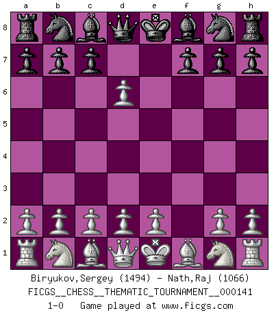 Last move : 1-0 2012 February 18 7:45:35 [Event "FICGS__CHESS__THEMATIC_TOURNAMENT__000141"] [Site "FICGS"] [Date "2012.01.07"] [Round "1"] [White "Biryukov,Sergey"] [Black "Nath,Raj"] [Result "1-0"] [WhiteElo "1494"] [BlackElo "1066"] 1.f4 e5 2.fxe5 d6 3.exd6 1-0 This chess game has been lost on time (started : 2012.01.07 10:14:3) Bird : From gambit Player White won this chess game. Follow this game move after move (download)Of Chess it has been said that life is not long enough for it, but that is the fault of life, not Chess. (William Ewart Napier) Ich kenne Menschen, die allen Willen der Welt besitzen und doch nicht Schach spielen können. (Robert James Fischer) El Ajedrez demanda una total concentración. (Bobby Fischer) Comme les marins qui ont mille raisons différentes d'aller en mer, les joueurs d'échecs en ont tout autant avant de s'installer devant une table et jouer... (Vincent Bertignac, philosophe) Wisdom is the reward you get for a lifetime of listening when you'd have preferred to talk. (Doug Larson)