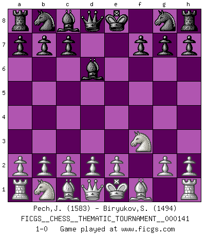 Last move : 1-0 2012 March 16 8:53:17 [Event "FICGS__CHESS__THEMATIC_TOURNAMENT__000141"] [Site "FICGS"] [Date "2012.01.07"] [Round "1"] [White "Pech,Jaroslav senior"] [Black "Biryukov,Sergey"] [Result "1-0"] [WhiteElo "1583"] [BlackElo "1494"] 1.f4 e5 2.fxe5 d6 3.exd6 Bxd6 4.Nf3 1-0 This chess game has been lost on time (started : 2012.01.07 10:14:3) Bird : From gambit Player White won this chess game. Follow this game move after move (download)Look at Garry Kasparov. After he loses, invariably he wins the next game. He just kills the next guy. That's something that we have to learn to be able to do. (Maurice Ashley) Über Kasparov: Es ist offensichtlich, daß er in einem totalitären Staat aufwuchs und deshalb zu diktatorischen Zügen neigt. (Viktor Kortschnoi) Siempre es mucho mejor sacrificar las piezas de tu oponente. (Savielly Tartakover) Horreur, mais aussi harmonie suprême : qu'y avait-il en effet au monde en dehors des échecs ? Le brouillard, l'inconnu, le non-être... (Vladimir Nabokov) The human is the only animal species whose members are able to talk themselves into difficulties that would not otherwise exist. (Wendell Johnson)