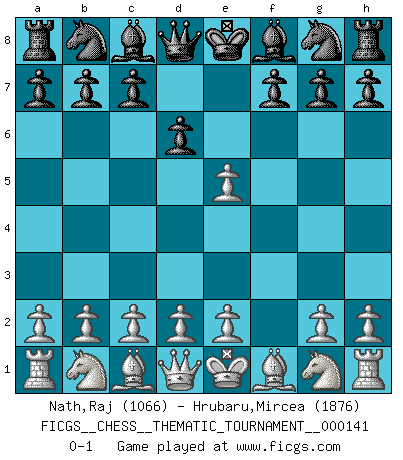 Last move : 0-1 2012 February 16 19:46:31 [Event "FICGS__CHESS__THEMATIC_TOURNAMENT__000141"] [Site "FICGS"] [Date "2012.01.07"] [Round "1"] [White "Nath,Raj"] [Black "Hrubaru,Mircea"] [Result "0-1"] [WhiteElo "1066"] [BlackElo "1876"] 1.f4 e5 2.fxe5 d6 0-1 This chess game has been lost on time (started : 2012.01.07 10:14:3) Bird : From gambit Player Black won this chess game. Follow this game move after move (download)The enormous mental resilience, without which no Chess player can exist, was so much taken up by Chess that he could never free his mind of this game. (Albert Einstein) Kostenjuk hat keinen Sexappeal. (Loek van Wely) Hasta este punto, las blancas han seguido un análisis bien conocido. Pero ahora el hace un error fatal: empieza a usar su propia cabeza. (Siegbert Tarrasch) Votre seul travail dans les ouvertures est d'obtenir un milieu de partie jouable. (Lajos Portish) Those parts of the system that you can hit with a hammer (not advised) are called hardware; those program instructions that you can only curse at are called software. (Anonymous)