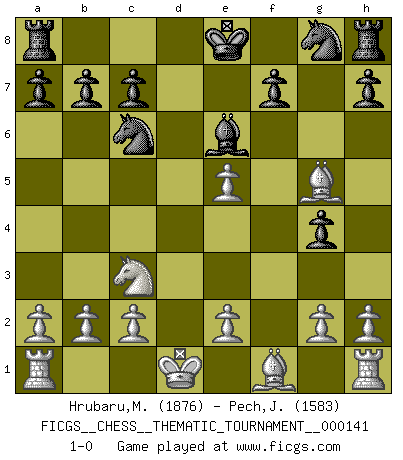 Last move : 1-0 2012 April 16 23:45:17 [Event "FICGS__CHESS__THEMATIC_TOURNAMENT__000141"] [Site "FICGS"] [Date "2012.01.07"] [Round "1"] [White "Hrubaru,Mircea"] [Black "Pech,Jaroslav senior"] [Result "1-0"] [WhiteElo "1876"] [BlackElo "1583"] 1.f4 e5 2.fxe5 d6 3.exd6 Bxd6 4.Nf3 g5 5.d4 g4 6.Ne5 Bxe5 7.dxe5 Qxd1+ 8.Kxd1 Nc6 9.Nc3 Be6 10.Bg5 1-0 This chess game has been lost on time (started : 2012.01.07 10:14:3) Bird : From gambit, Lasker variation Player White won this chess game. Follow this game move after move (download)Chess is a terrible game. If you have no center, your opponent has a freer position. If you do have a center, then you really have something to worry about ! (Siegbert Tarrasch) Schach ist mein Leben, meine Leidenschaft, was ich gelernt habe und seit meinem 14. Lebensjahr profimässig praktiziere. Darauf zu verzichten, würde mir sehr schwer fallen. (Viktor Kortschnoi) El Ajedrez es una hermosa aventura. (Bent Larsen) D'abord les bases : Jouez et étudiez, puis étudiez et jouez, ensuite jouez et étudiez, puis étudiez et jouez. Deuxièmement : Donnez toujours le meilleur de vous-même ! (Ken Smith) If we knew what we were doing, we would not call it research. (Albert Einstein)